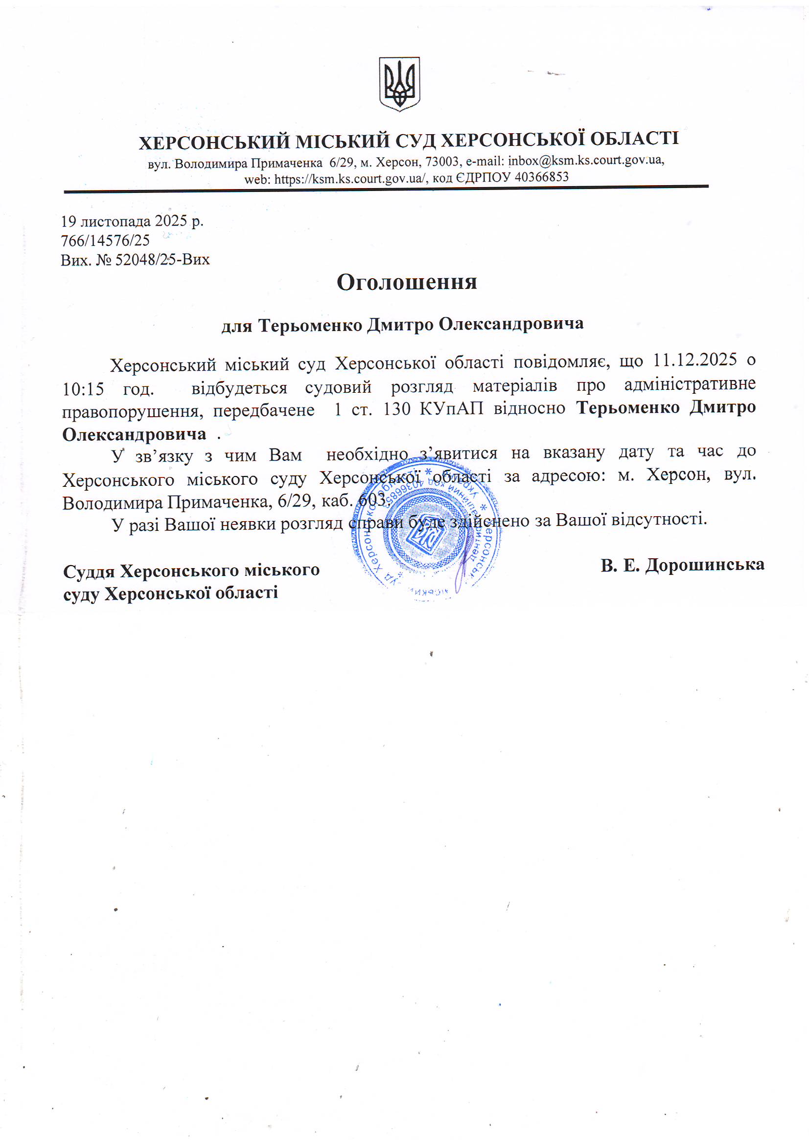 ОГОЛОШЕННЯ ПРО ВИКЛИК ДО СУДУ