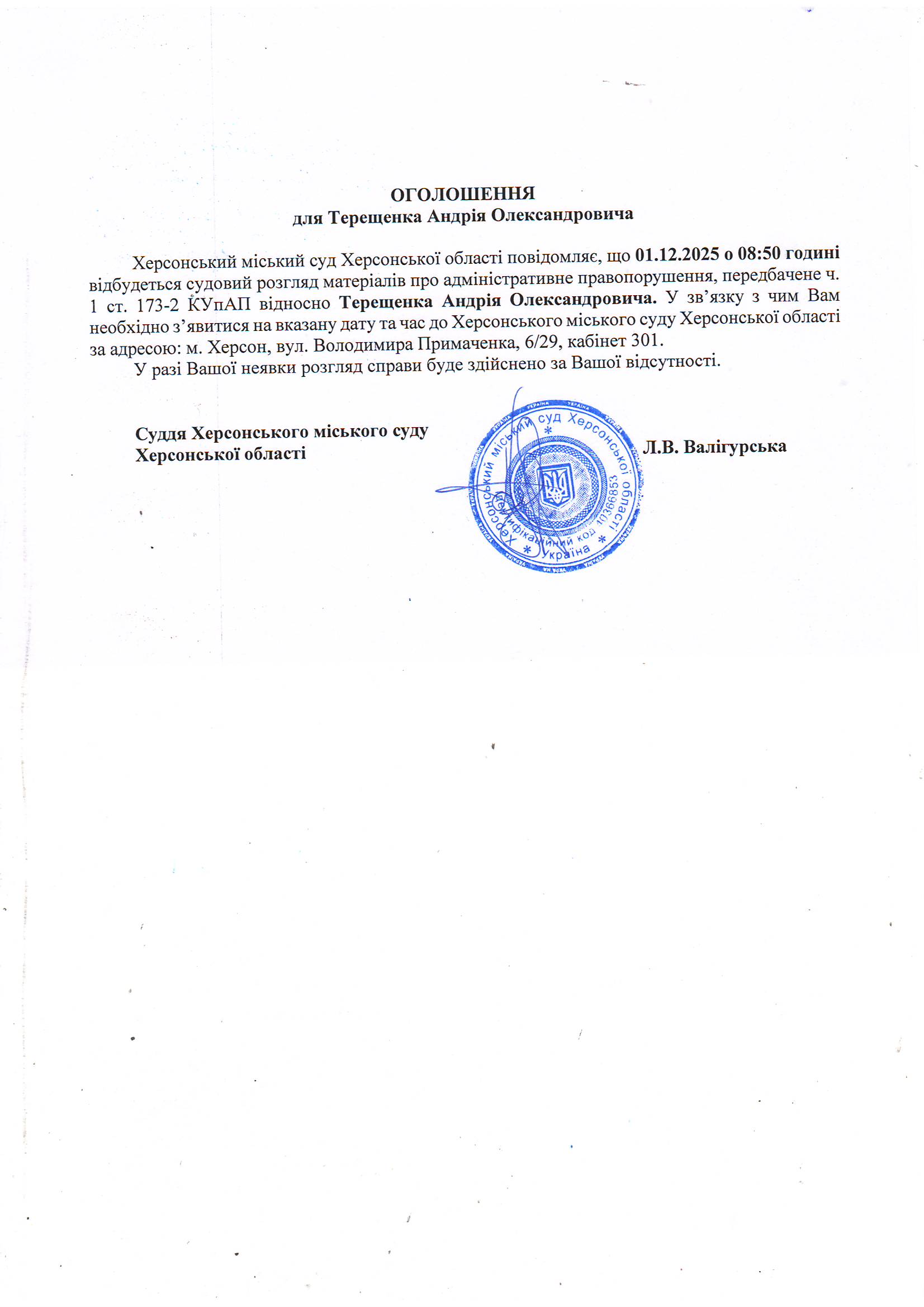 ОГОЛОШЕННЯ ПРО ВИКЛИК ДО СУДУ