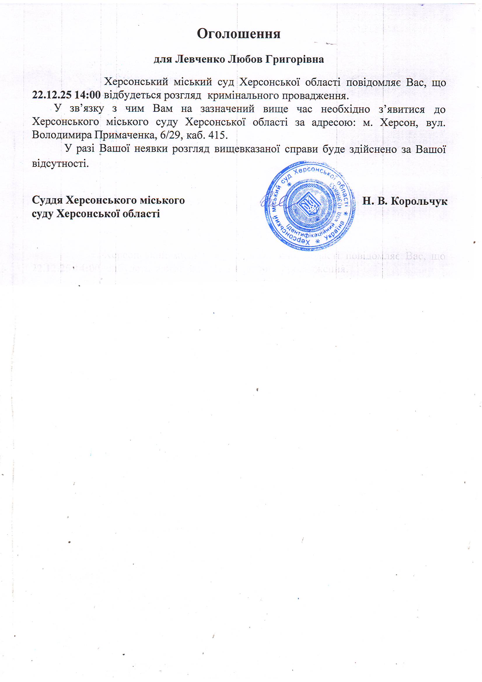 ОГОЛОШЕННЯ ПРО ВИКЛИК ДО СУДУ