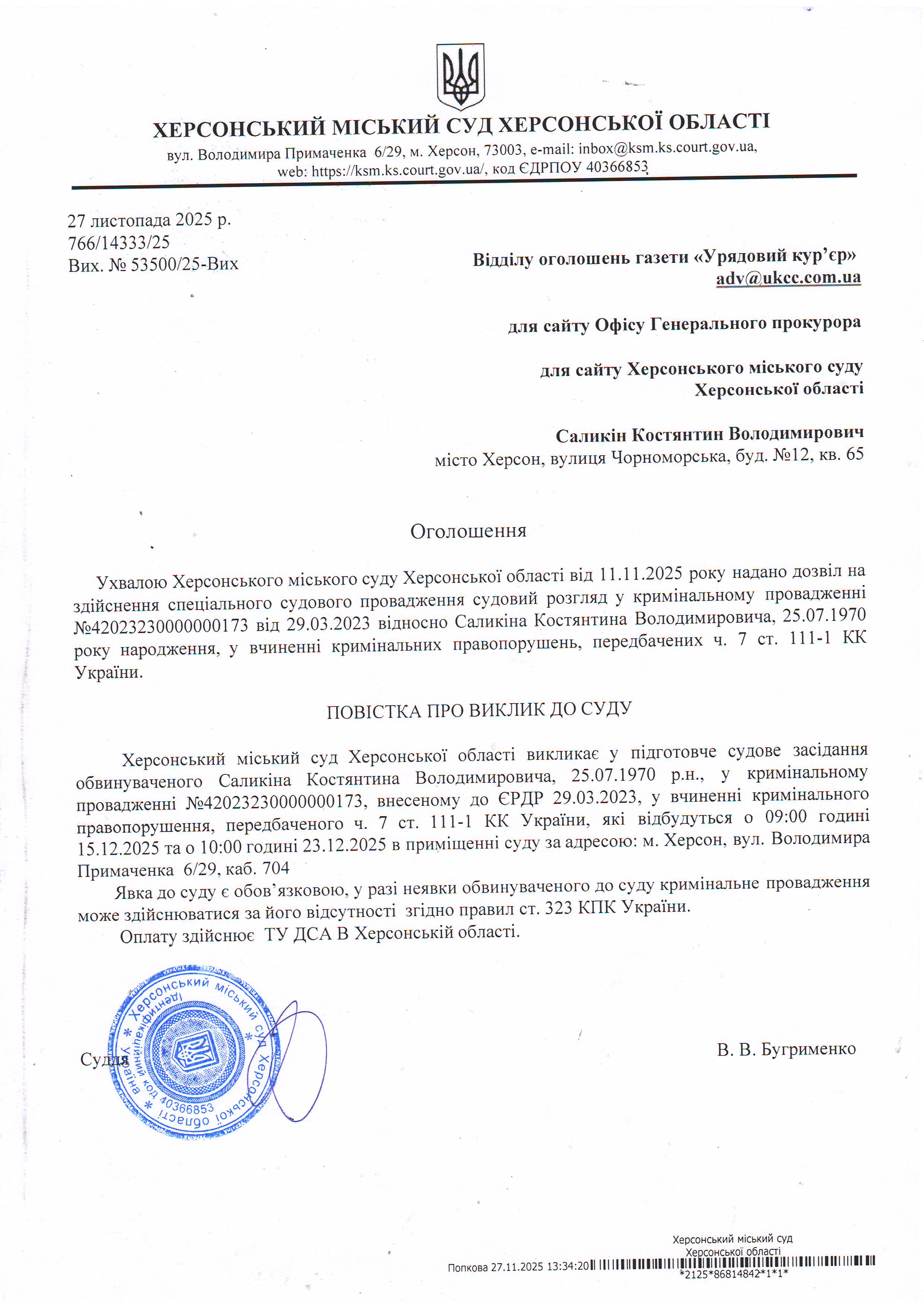 Оголошення про виклик особи в суд та повідомлення про судове рішення