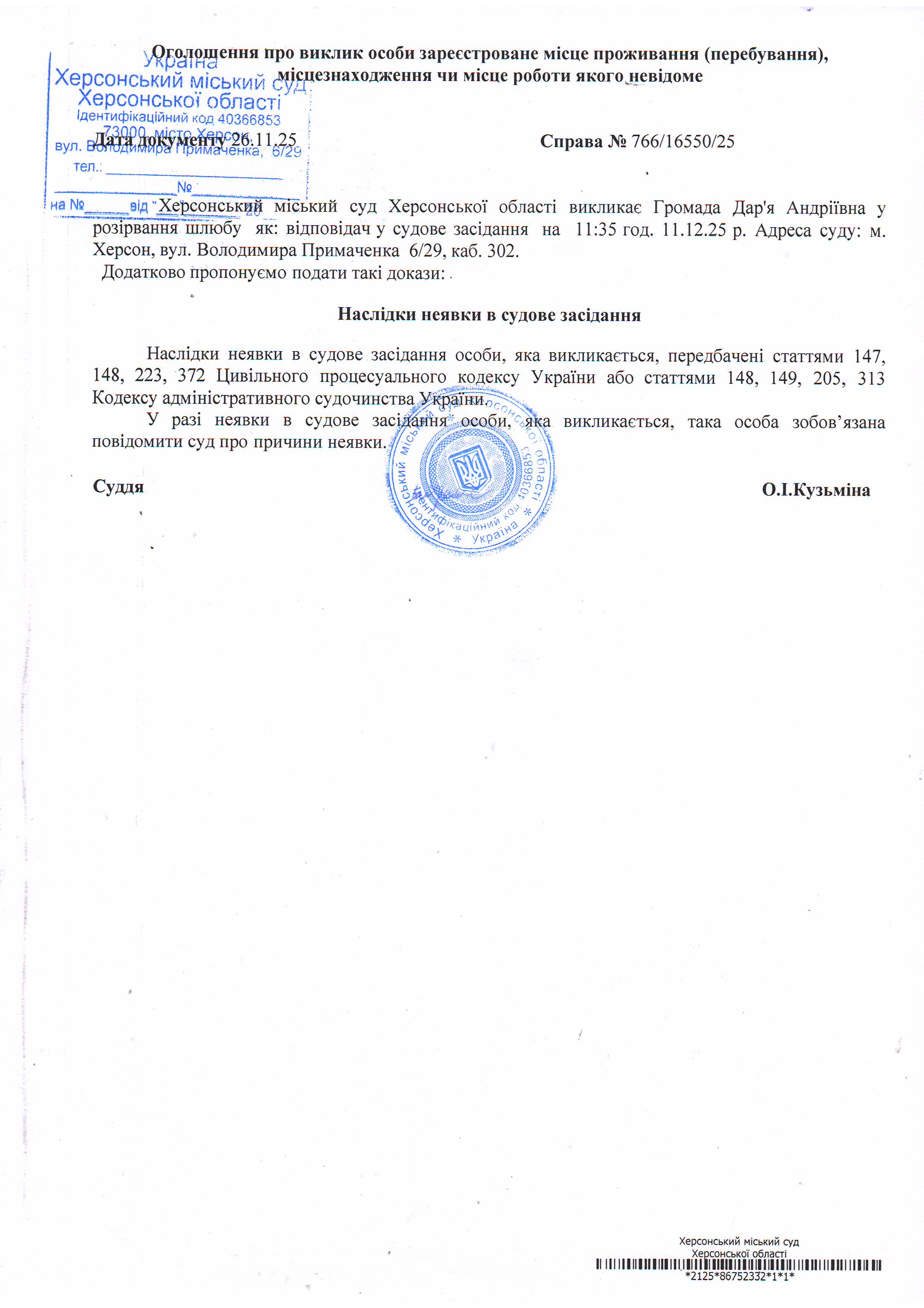 ОГОЛОШЕННЯ ПРО ВИКЛИК ДО СУДУ