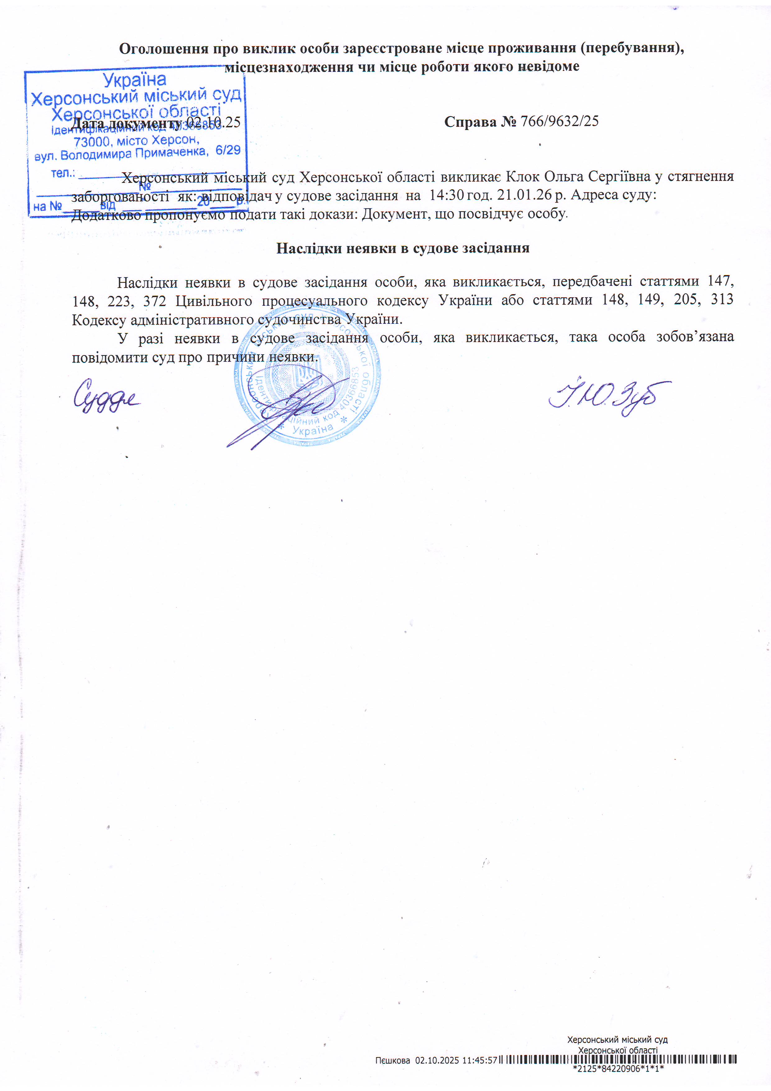 Оголошення про виклик особи в суд та повідомлення про судове рішення
