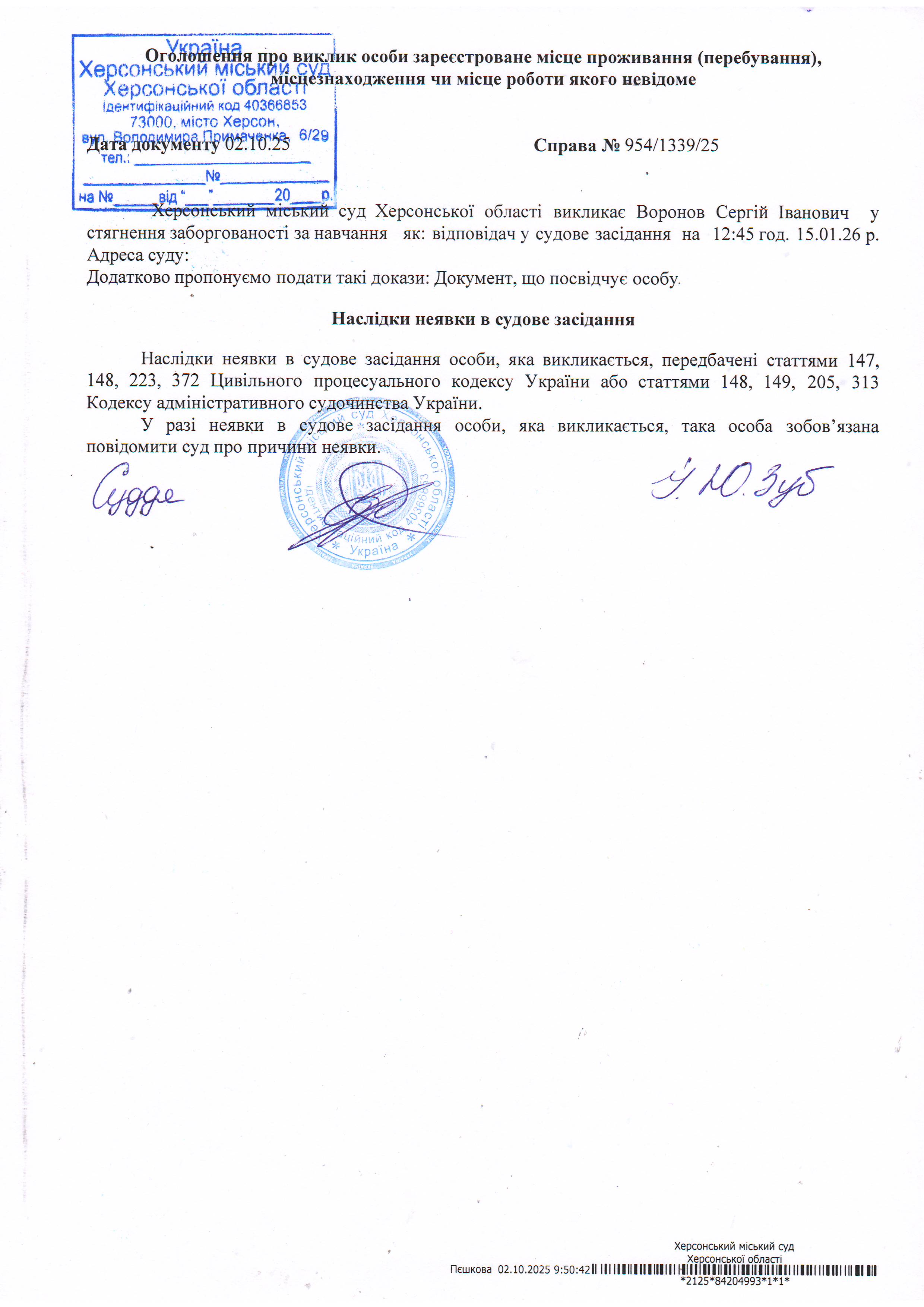 ОГОЛОШЕННЯ ПРО ВИКЛИК ДО СУДУ