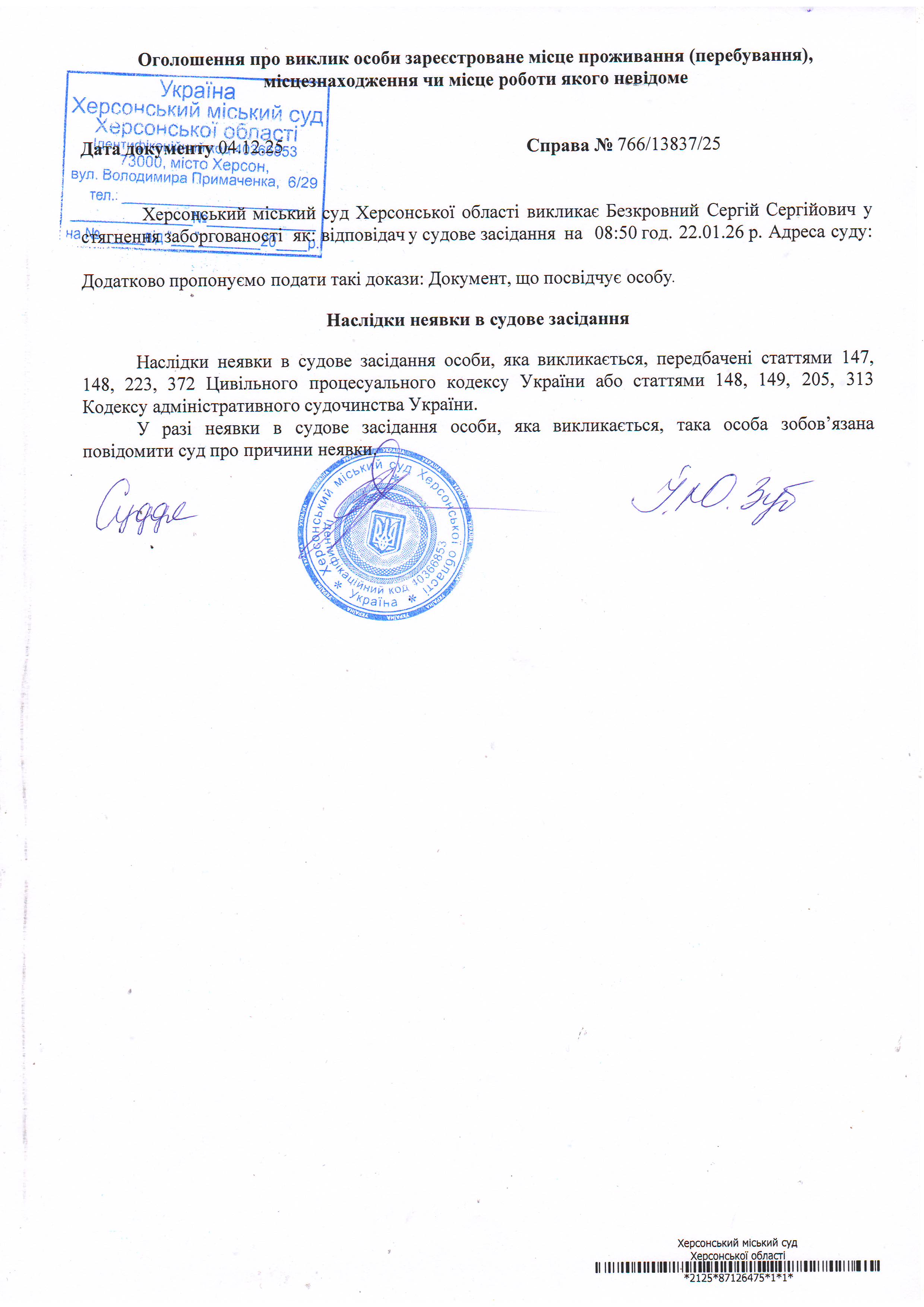 ОГОЛОШЕННЯ ПРО ВИКЛИК ДО СУДУ