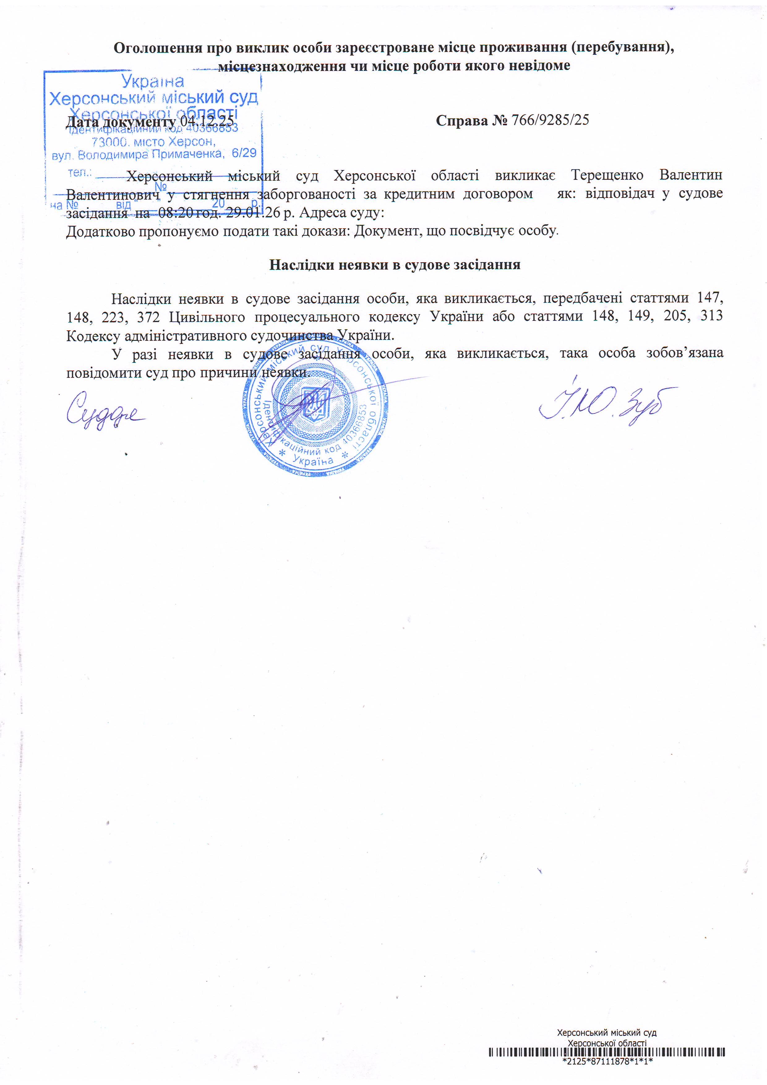 Оголошення про виклик особи в суд та повідомлення про судове рішення