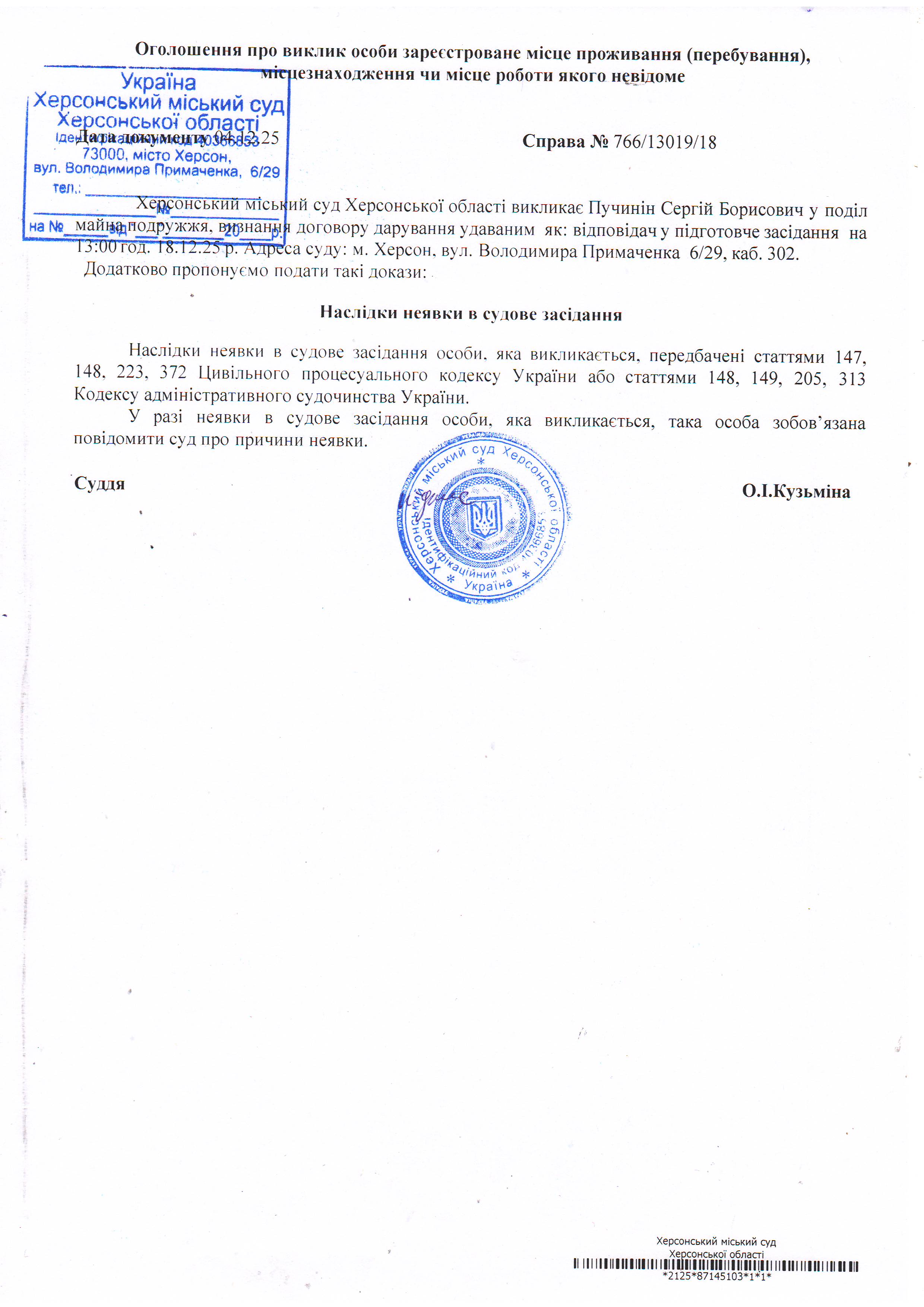 ОГОЛОШЕННЯ ПРО ВИКЛИК ДО СУДУ