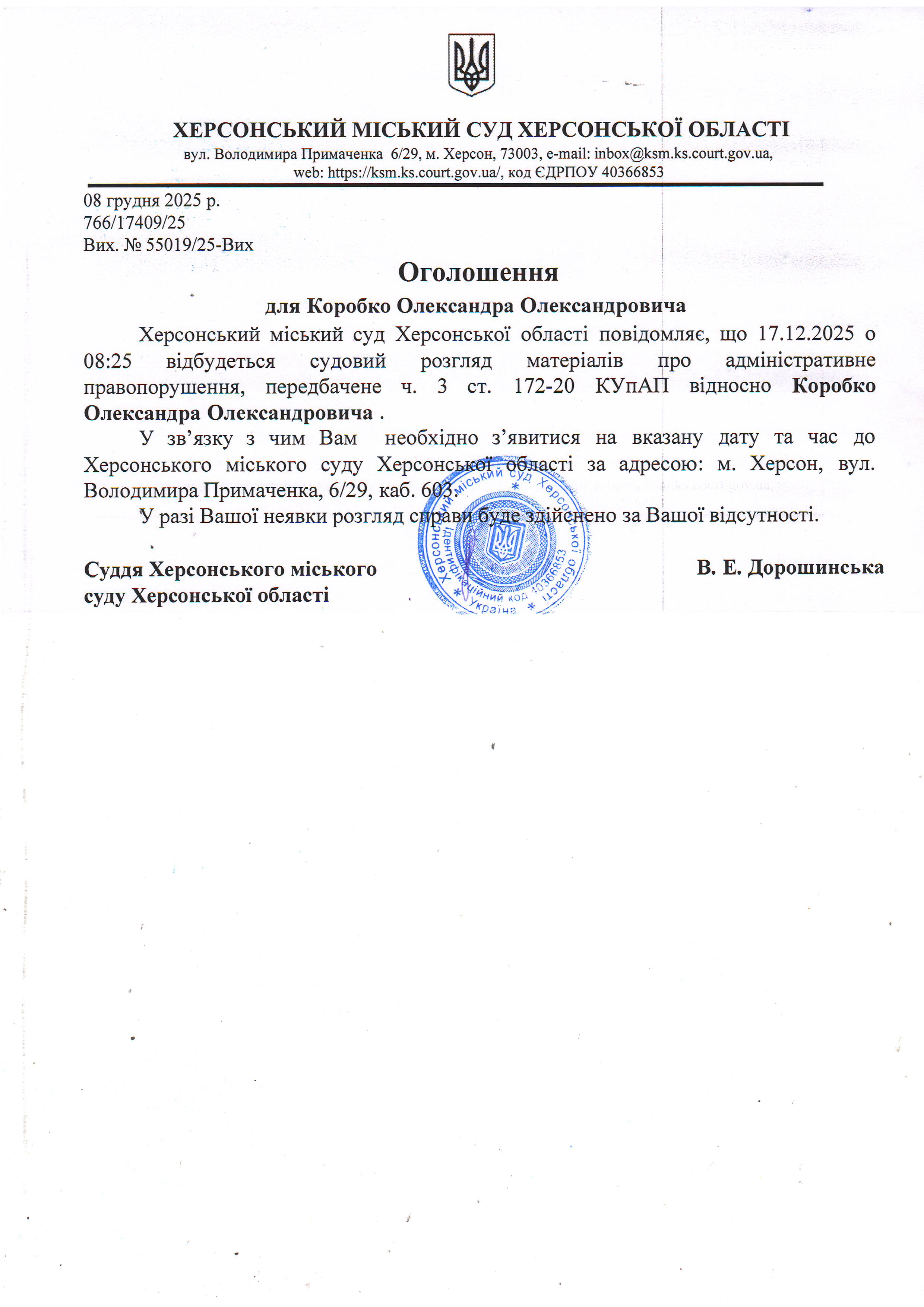 ОГОЛОШЕННЯ ПРО ВИКЛИК ДО СУДУ