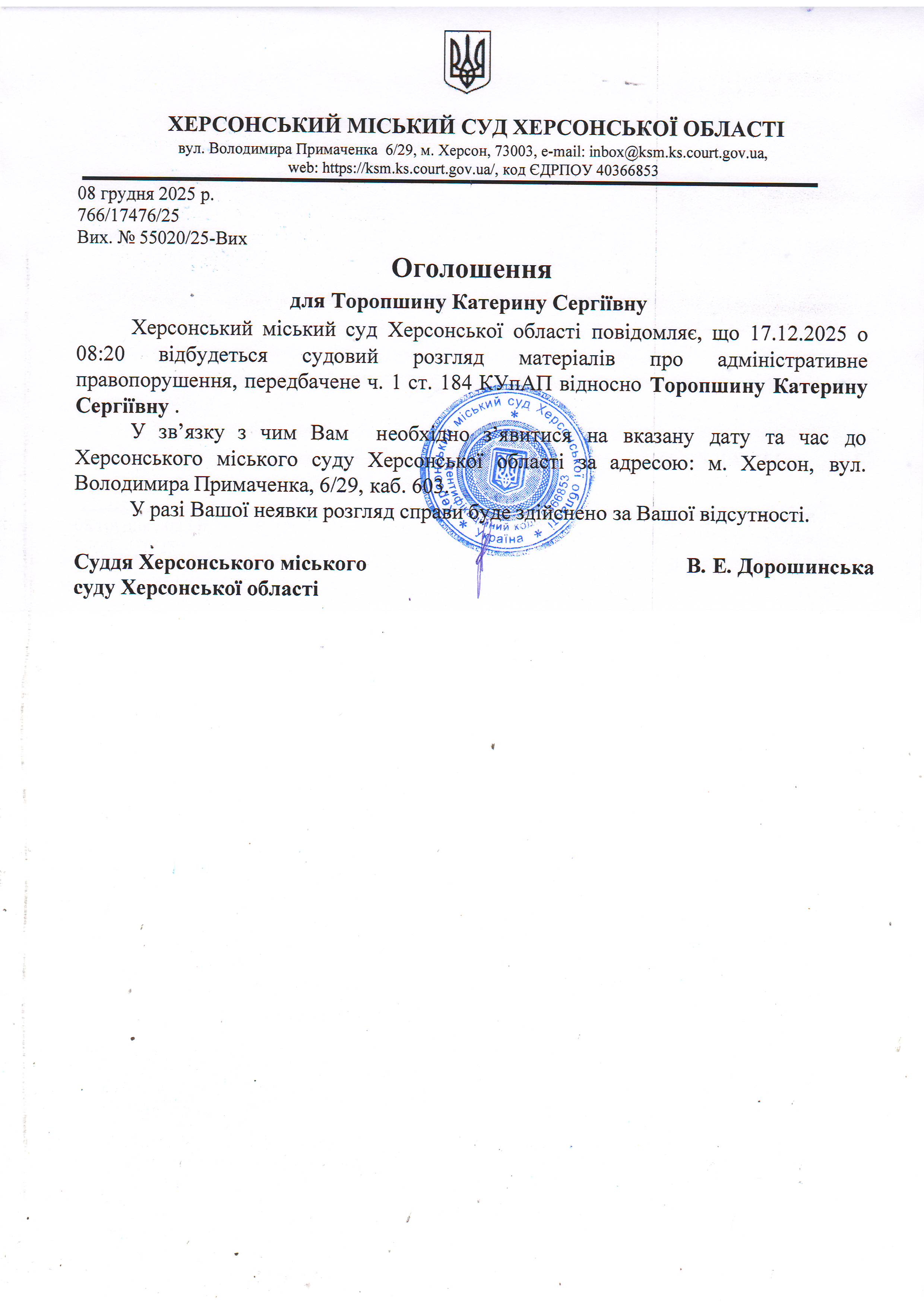 Оголошення для Торопшиної Катерини Сергіївни