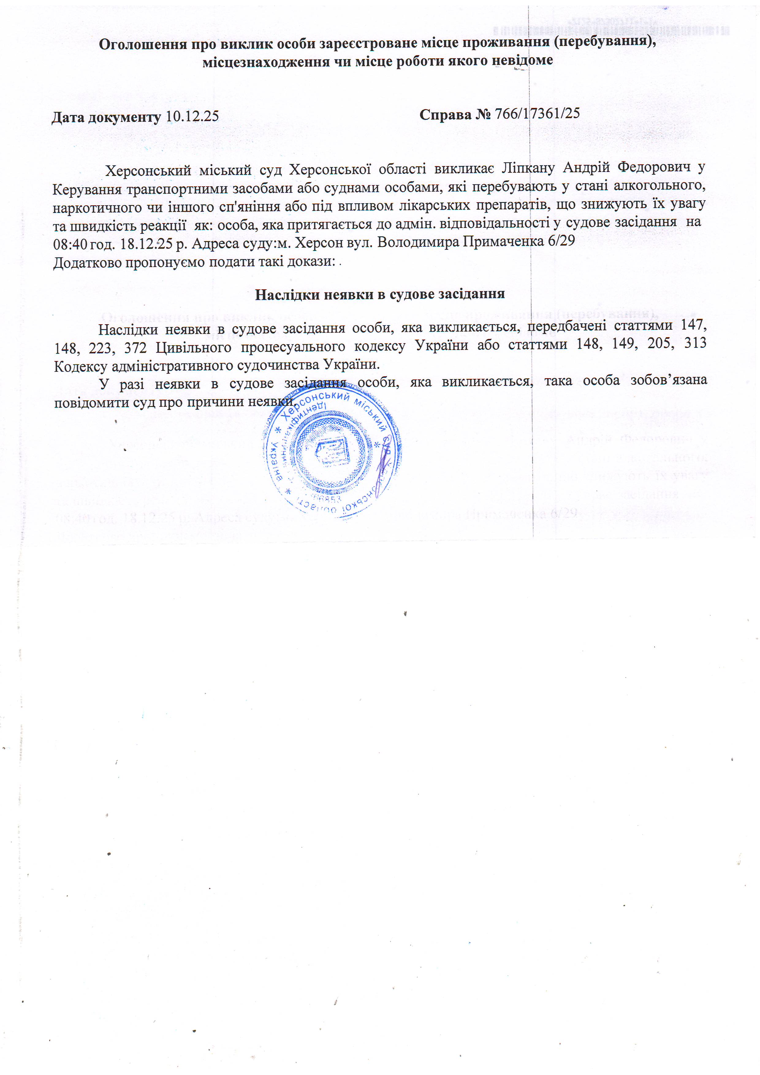 ОГОЛОШЕННЯ ПРО ВИКЛИК ДО СУДУ