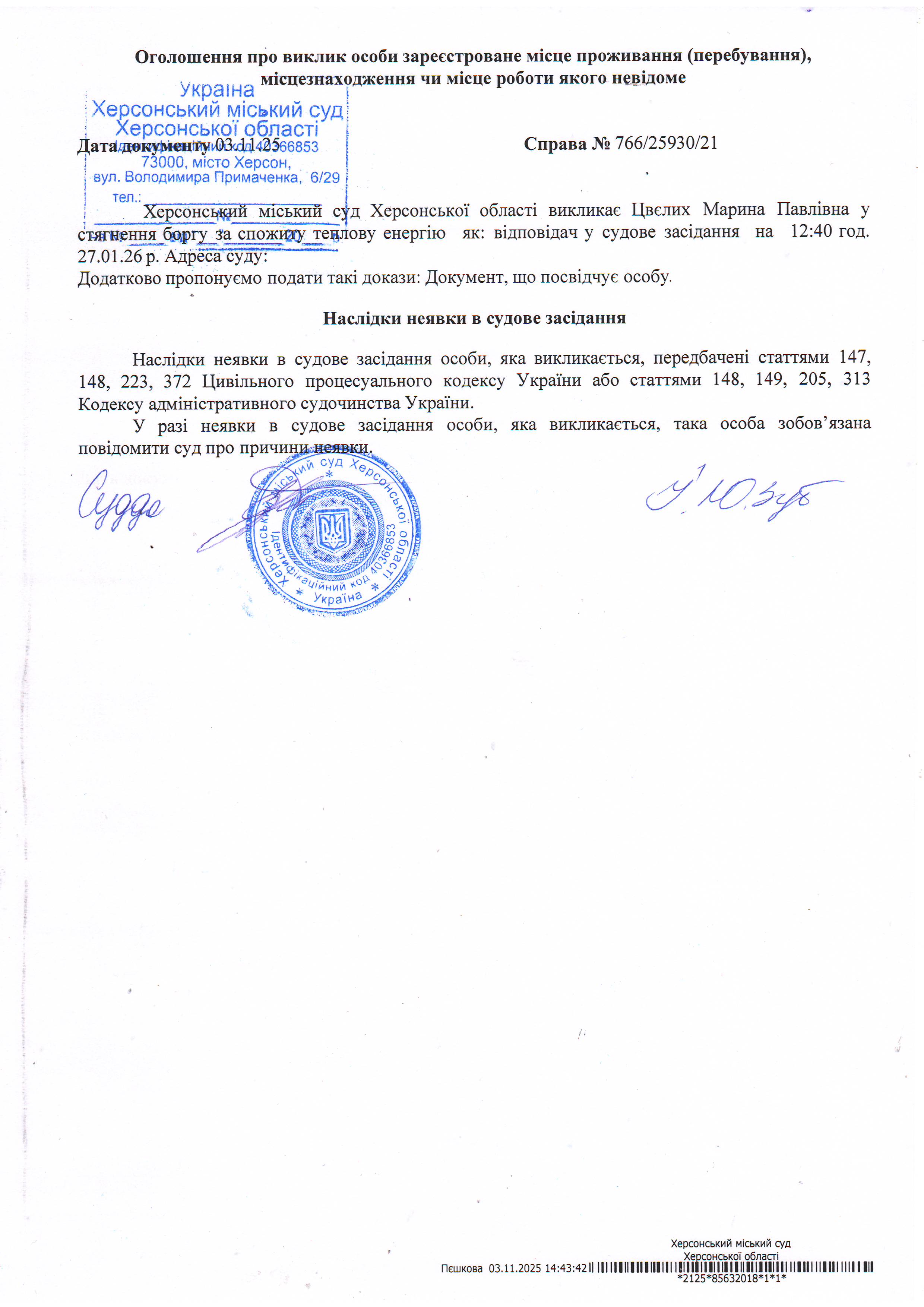 ОГОЛОШЕННЯ ПРО ВИКЛИК ДО СУДУ