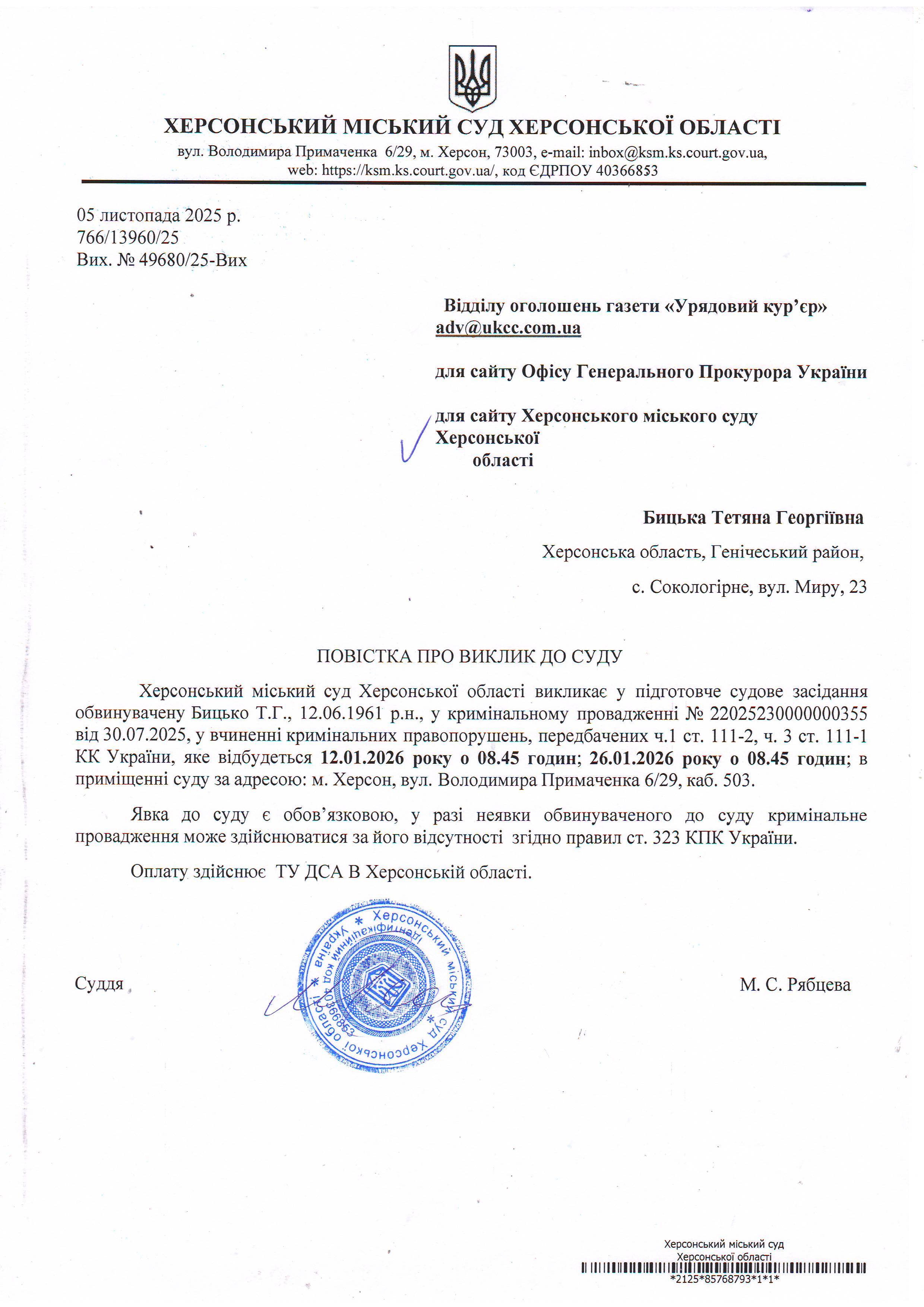 Оголошення про виклик особи в суд та повідомлення про судове рішення