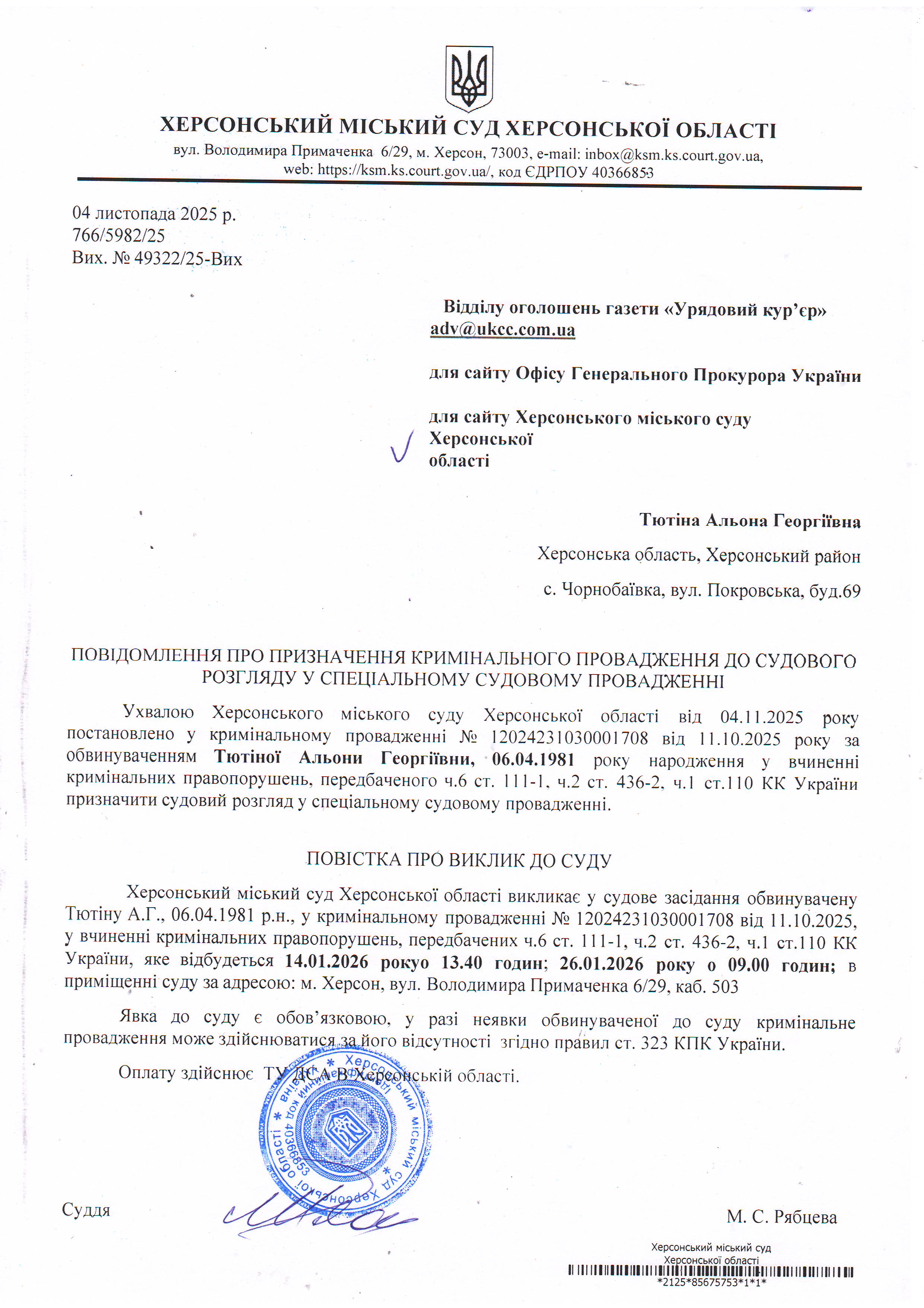 Оголошення для Тютіної Альони Георгіївни