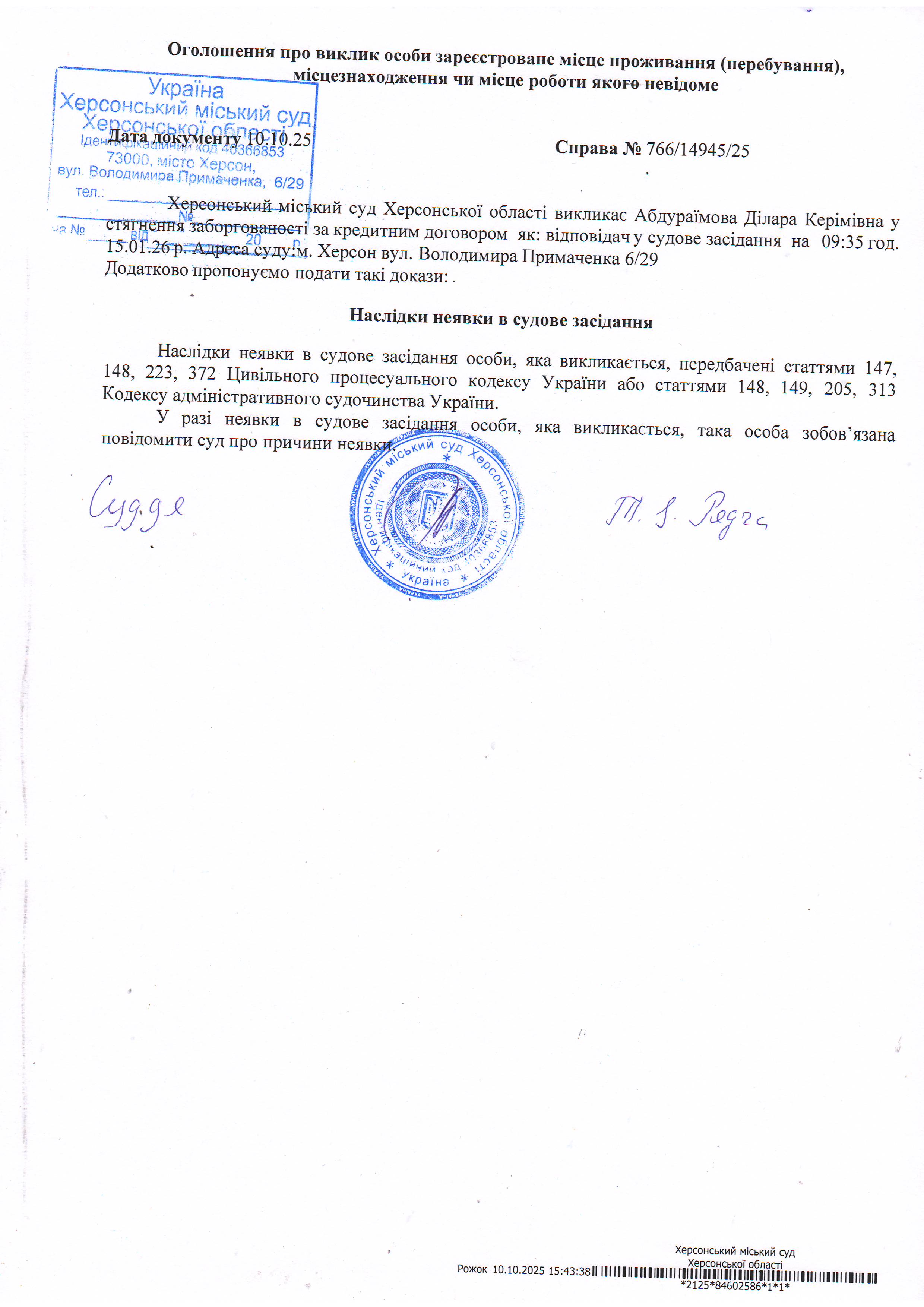 Оголошення про виклик особи в суд та повідомлення про судове рішення