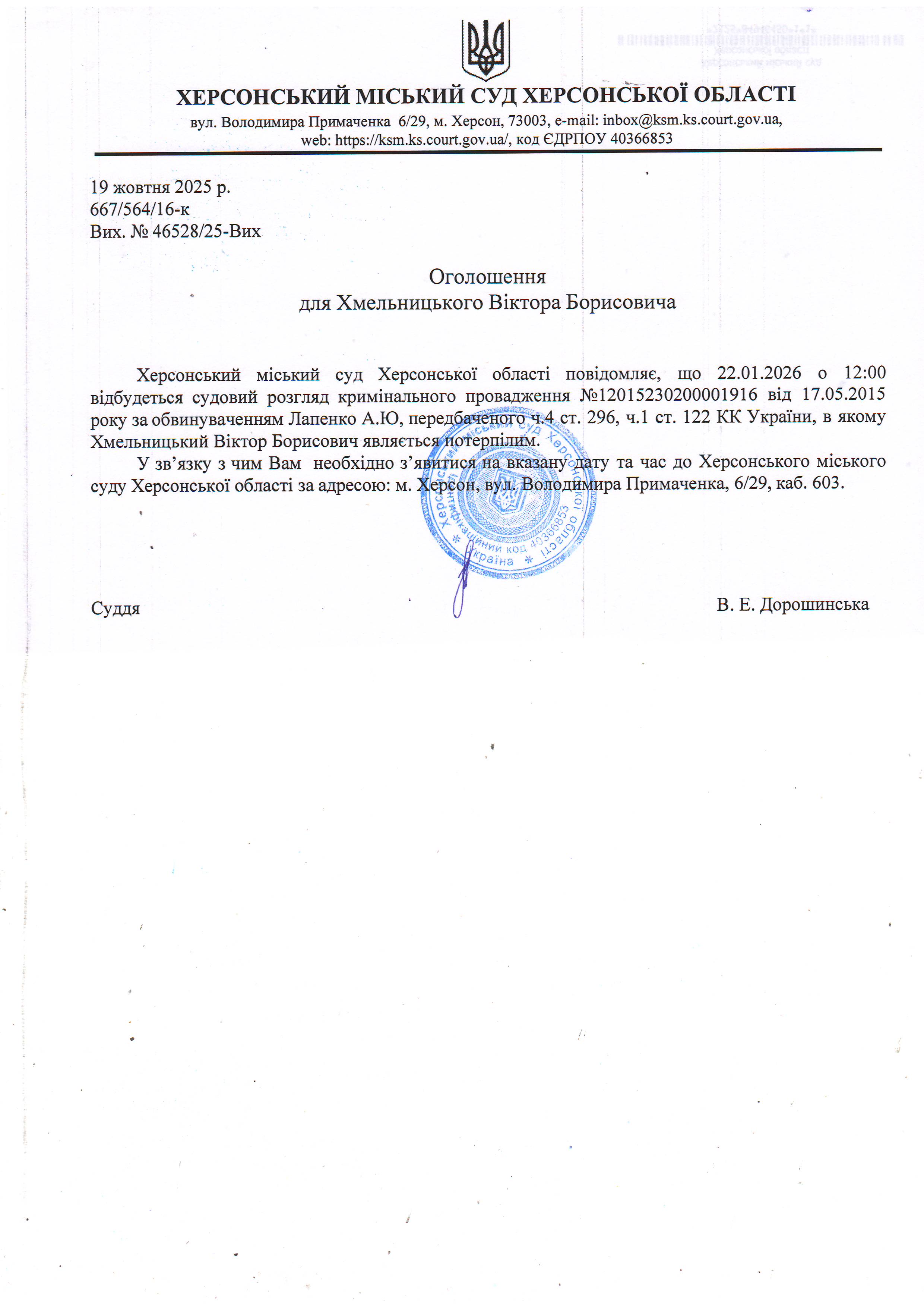 ОГОЛОШЕННЯ ПРО ВИКЛИК ДО СУДУ