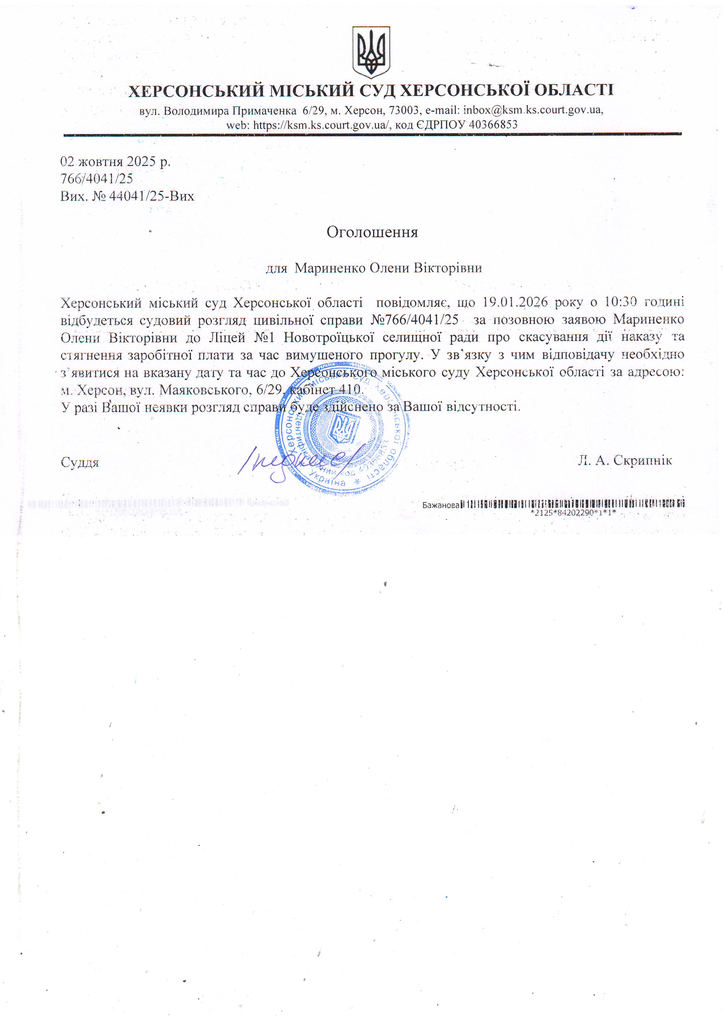 ОГОЛОШЕННЯ ПРО ВИКЛИК ДО СУДУ