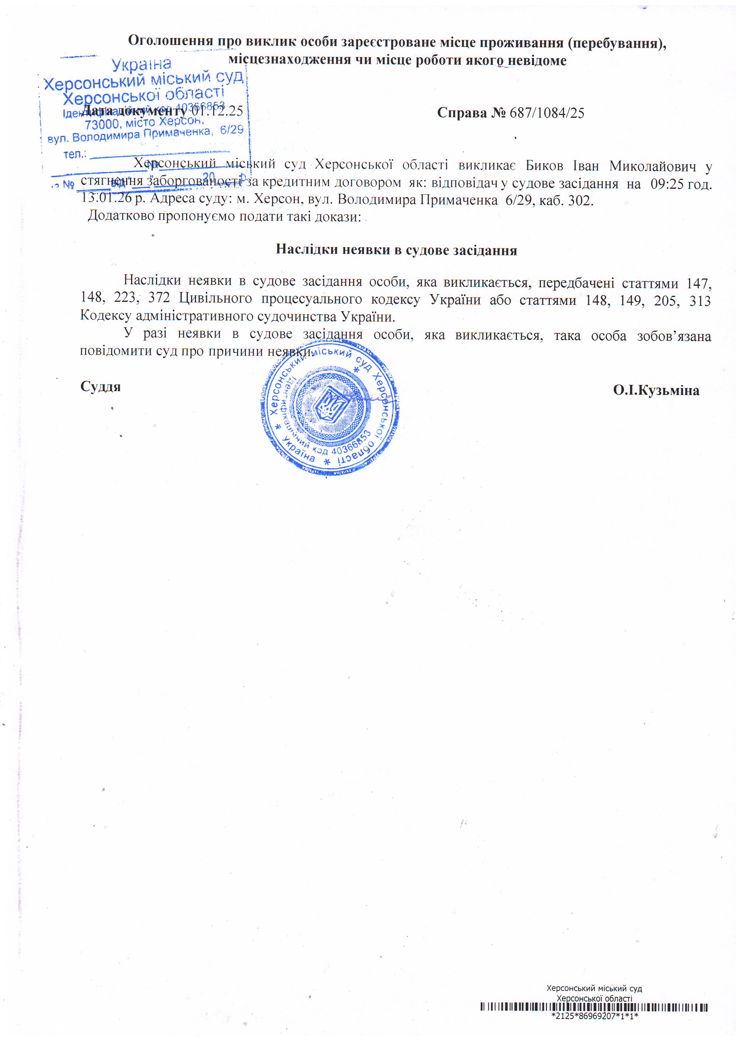 ОГОЛОШЕННЯ ПРО ВИКЛИК ДО СУДУ