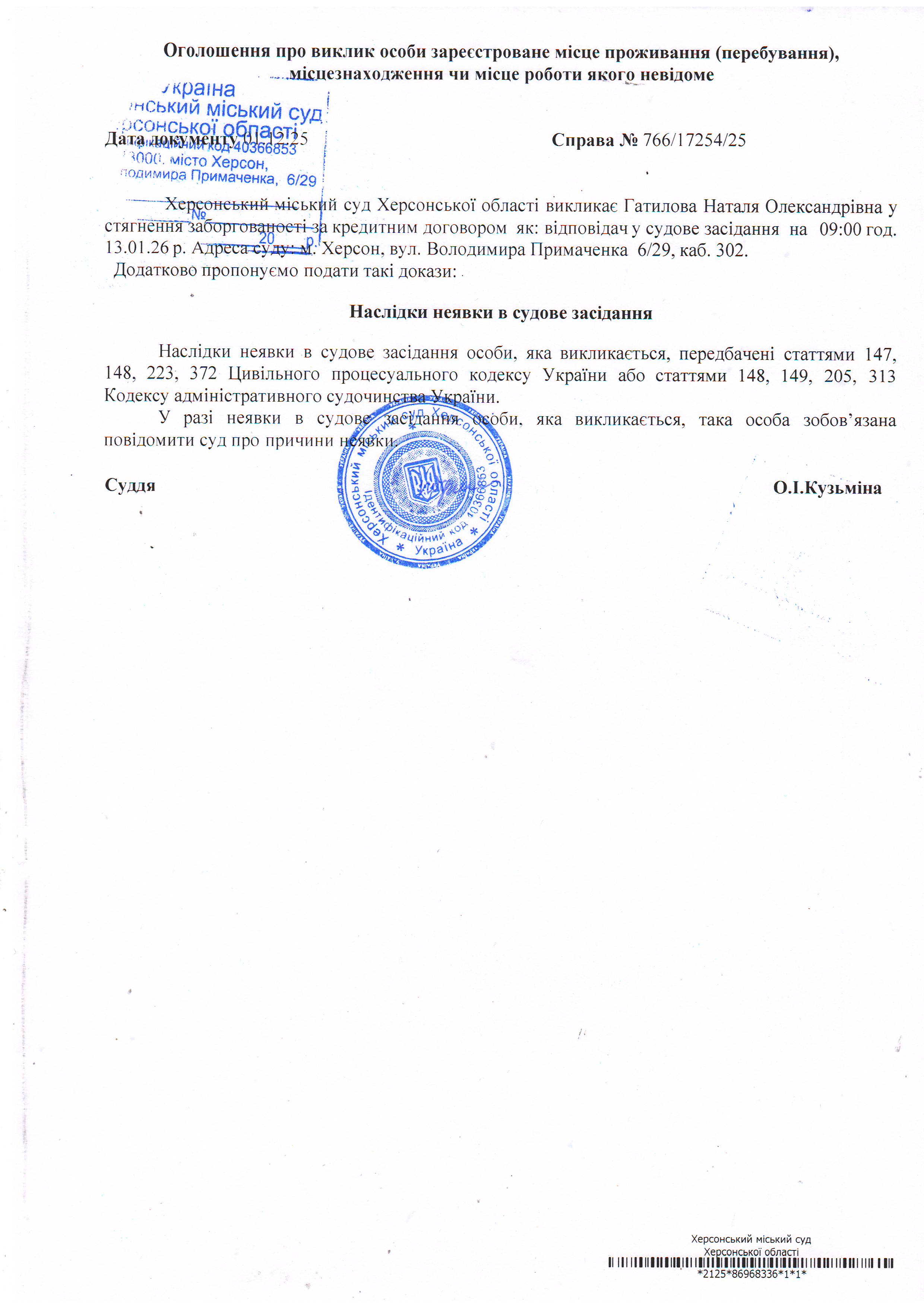 ОГОЛОШЕННЯ ПРО ВИКЛИК ДО СУДУ