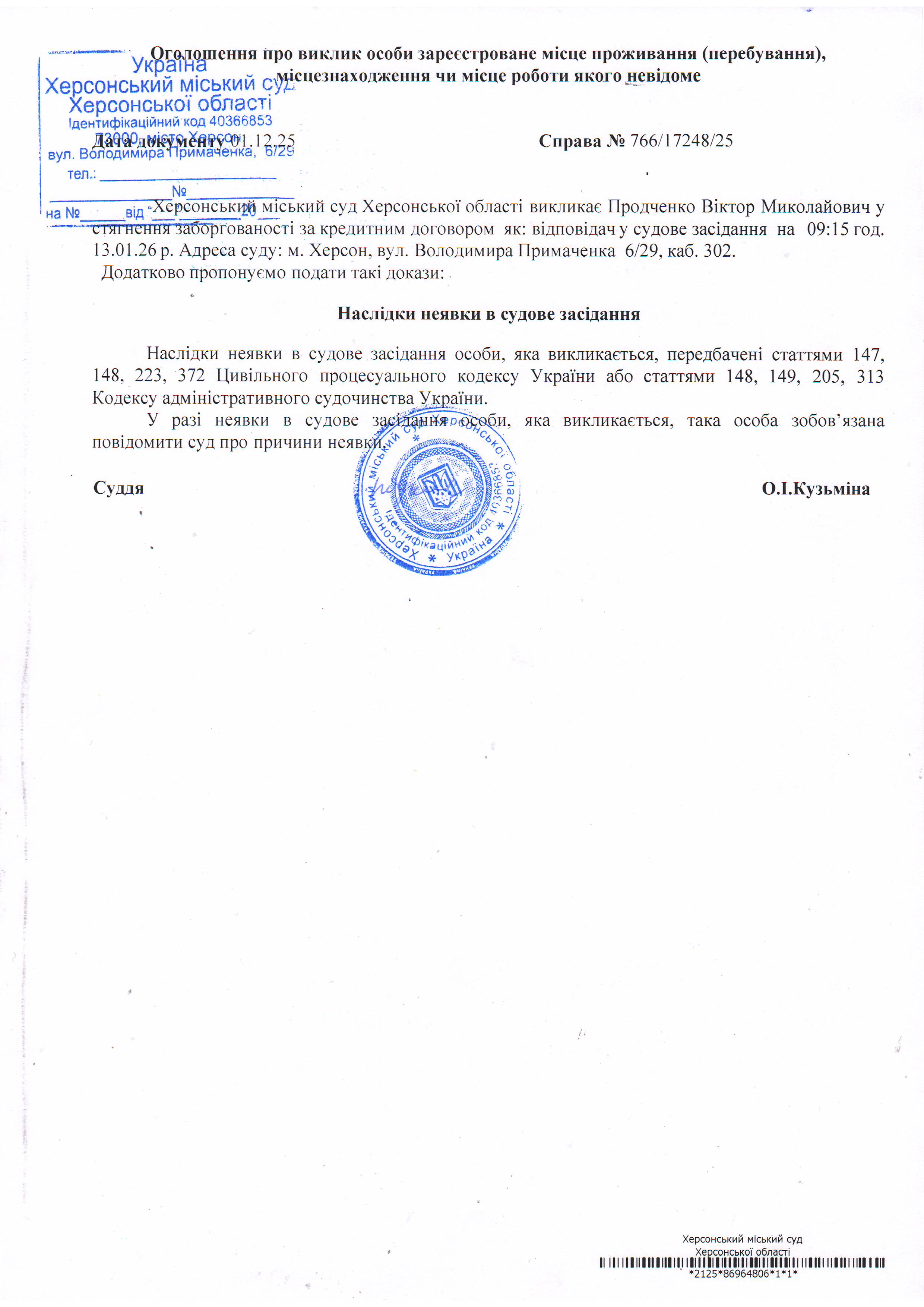 ОГОЛОШЕННЯ ПРО ВИКЛИК ДО СУДУ