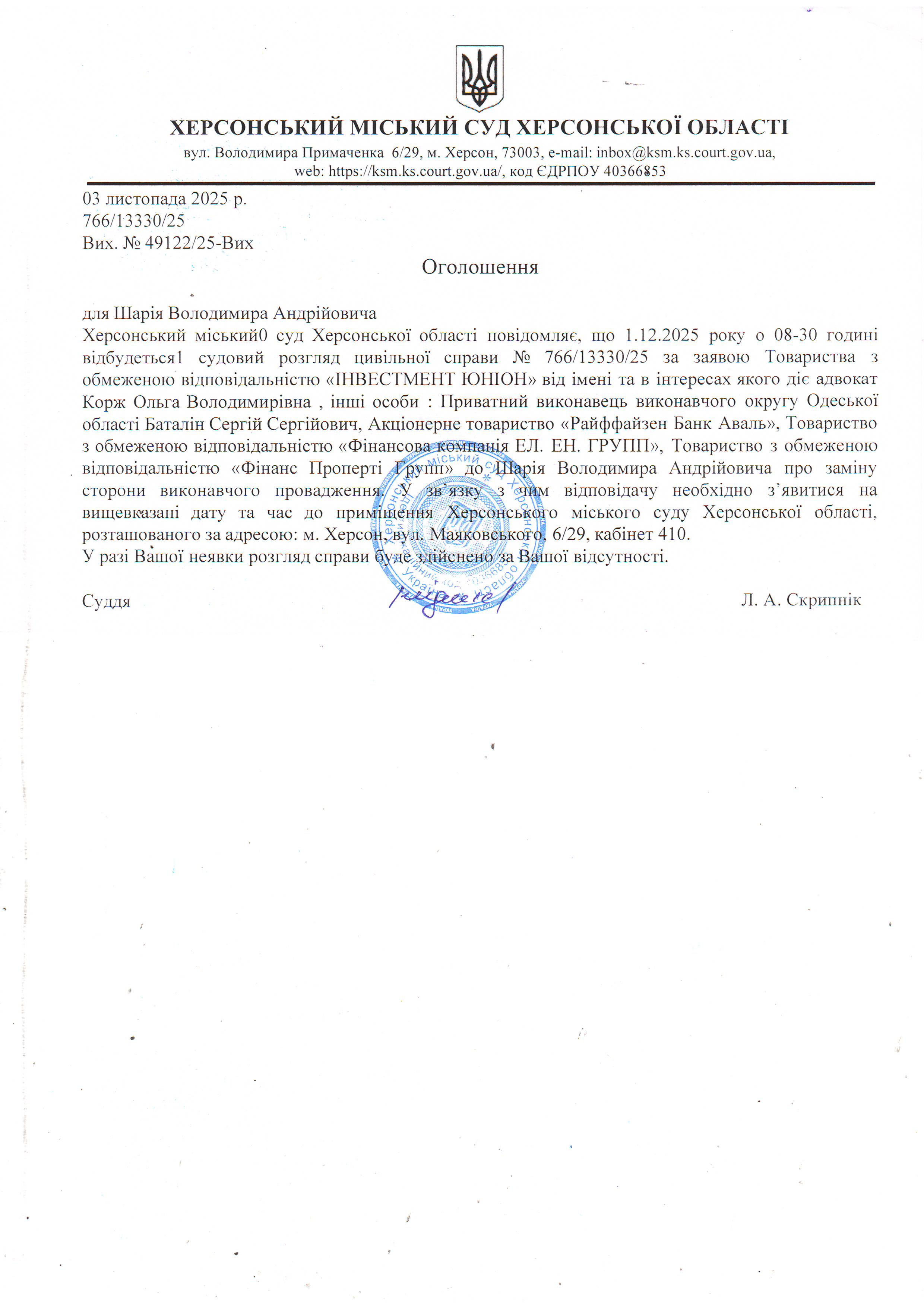 ОГОЛОШЕННЯ ПРО ВИКЛИК ДО СУДУ