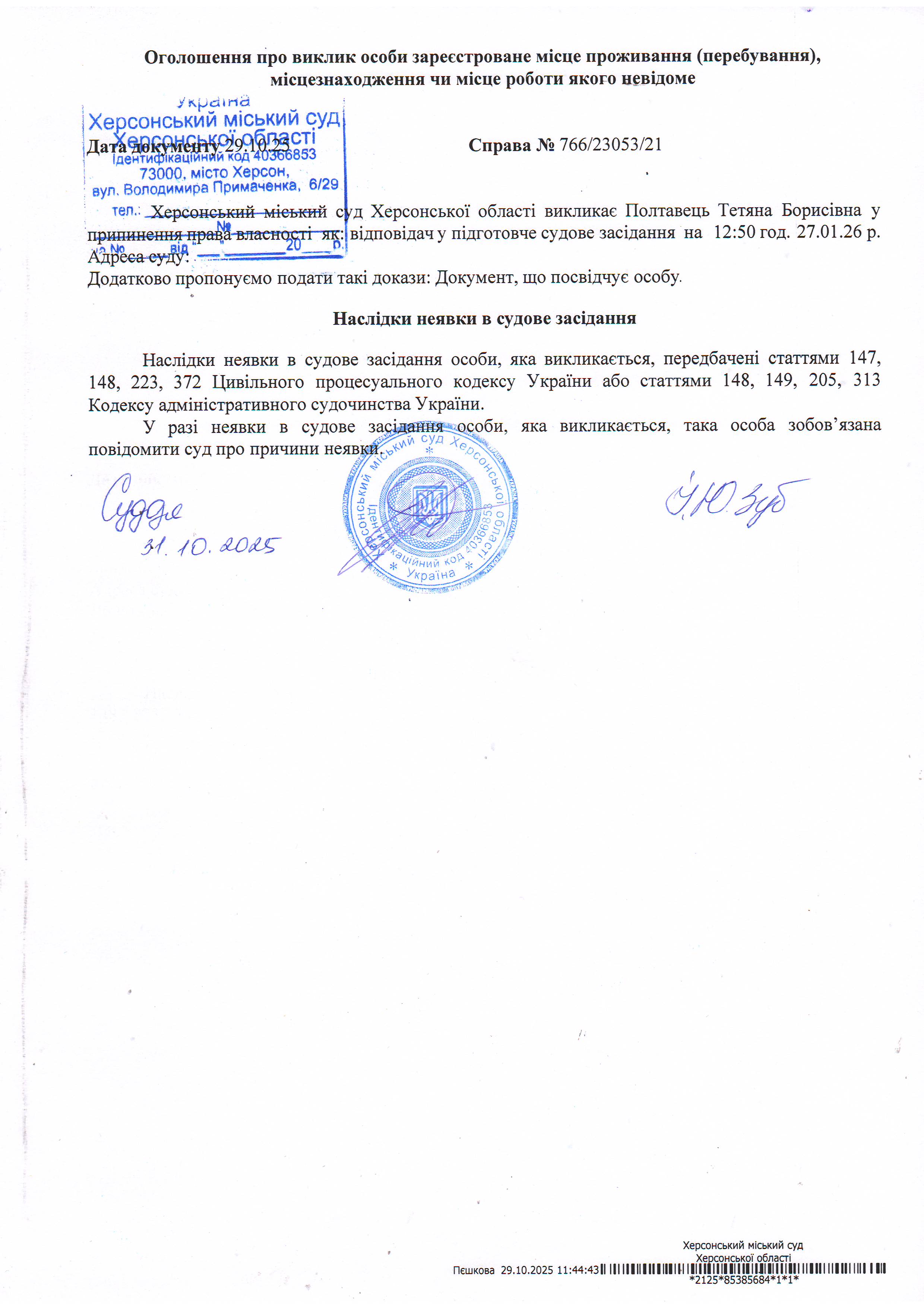 Оголошення про виклик особи в суд та повідомлення про судове рішення