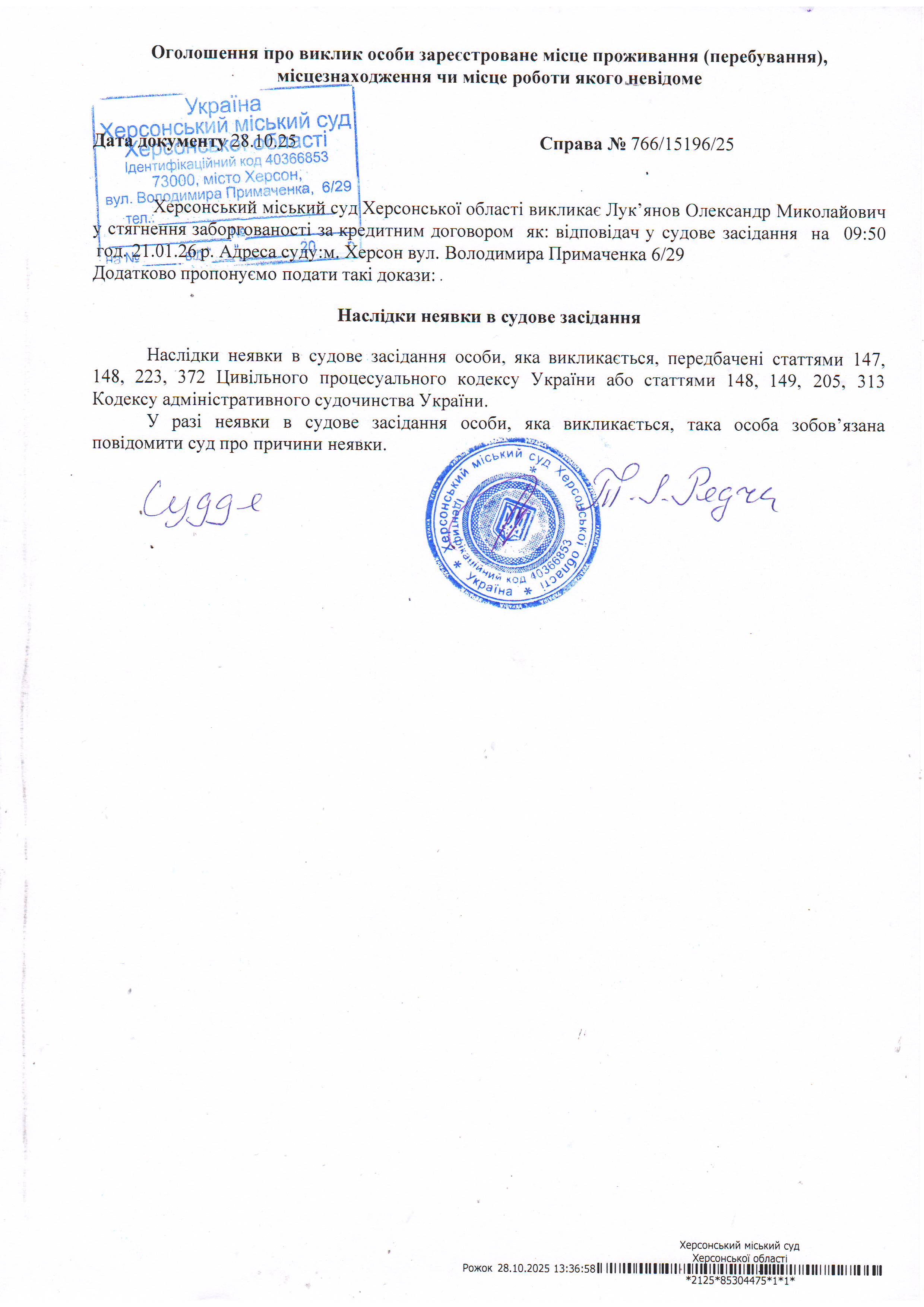 ОГОЛОШЕННЯ ПРО ВИКЛИК ДО СУДУ