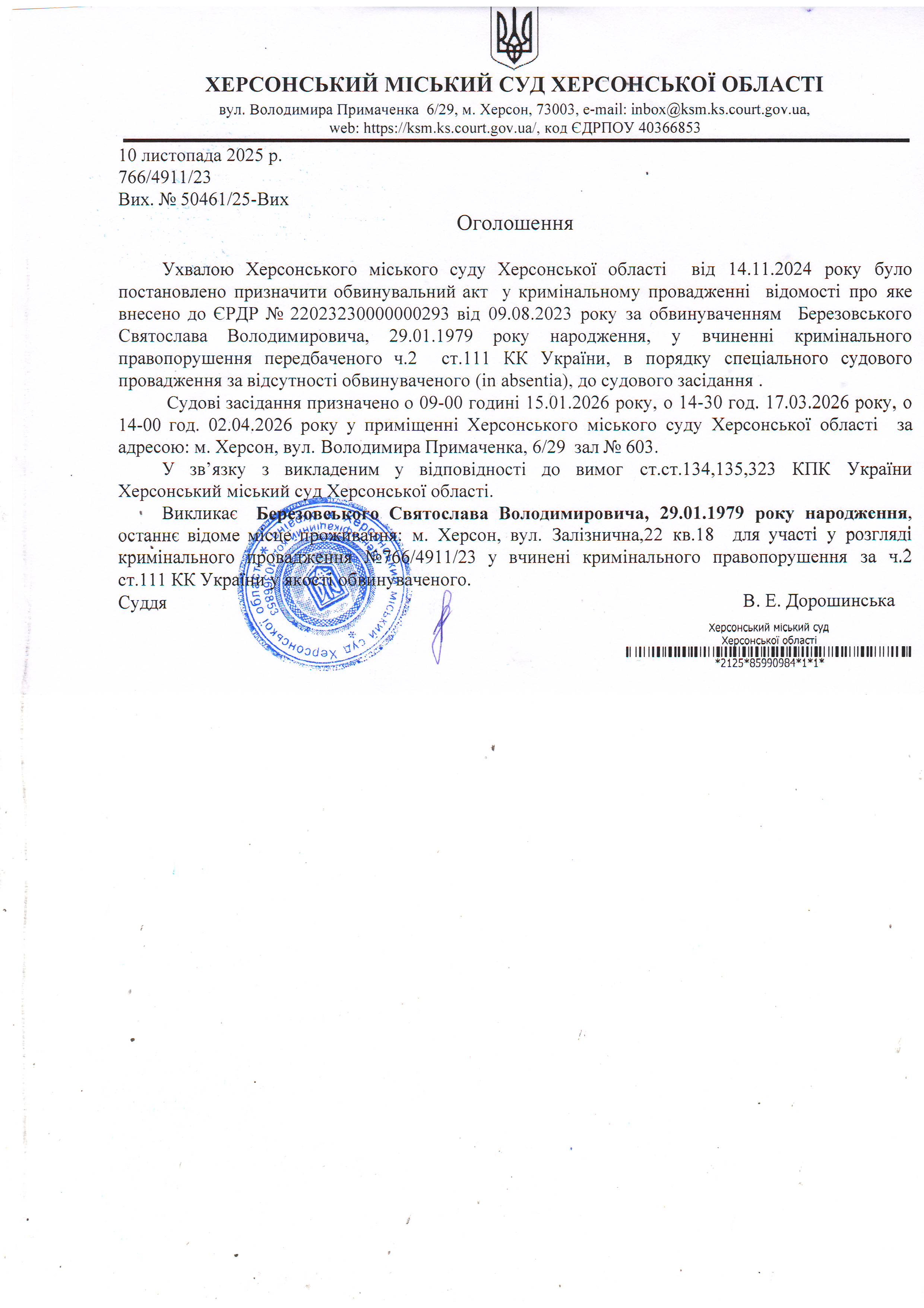 ОГОЛОШЕННЯ ПРО ВИКЛИК ДО СУДУ