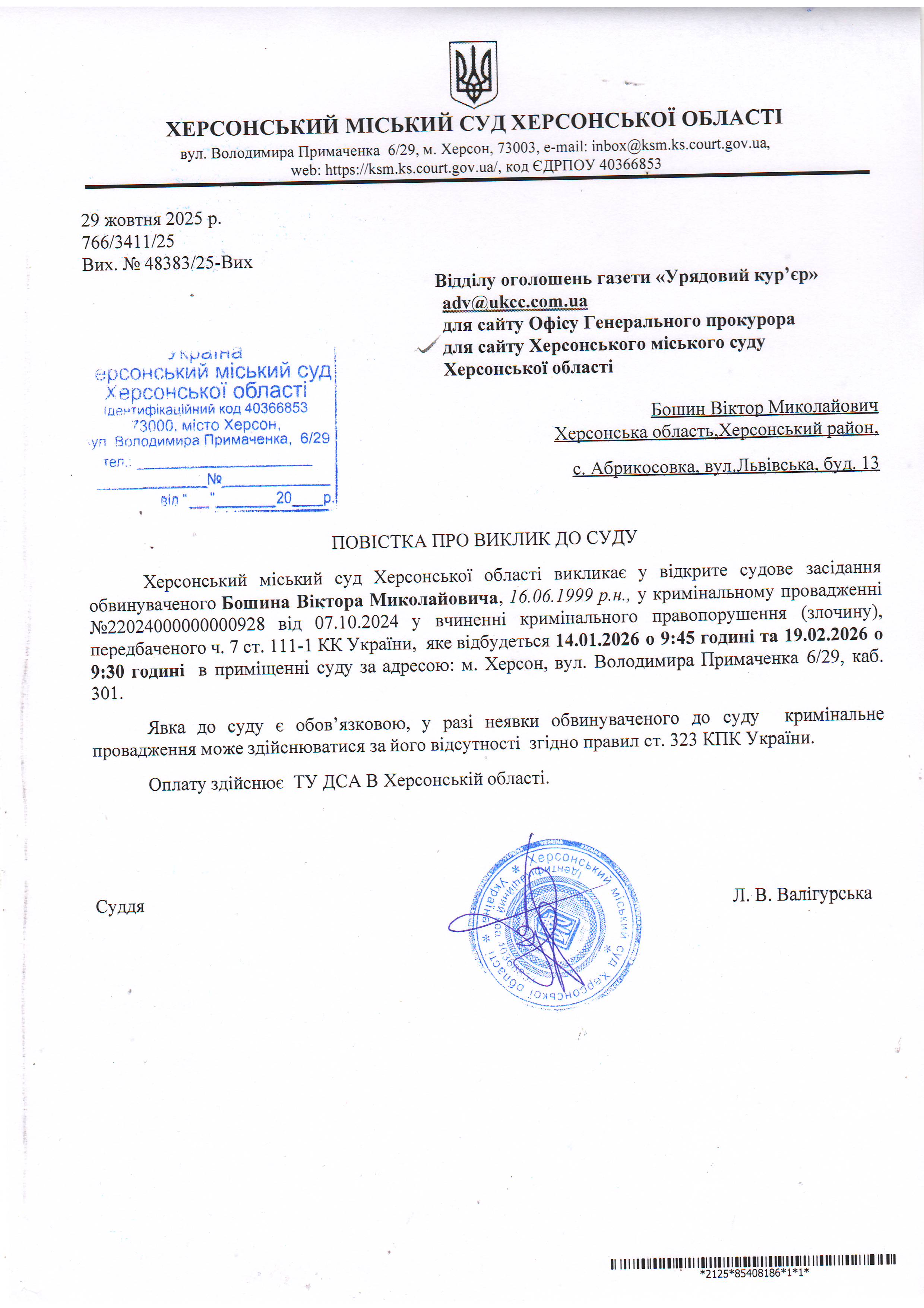 Оголошення про виклик особи в суд та повідомлення про судове рішення