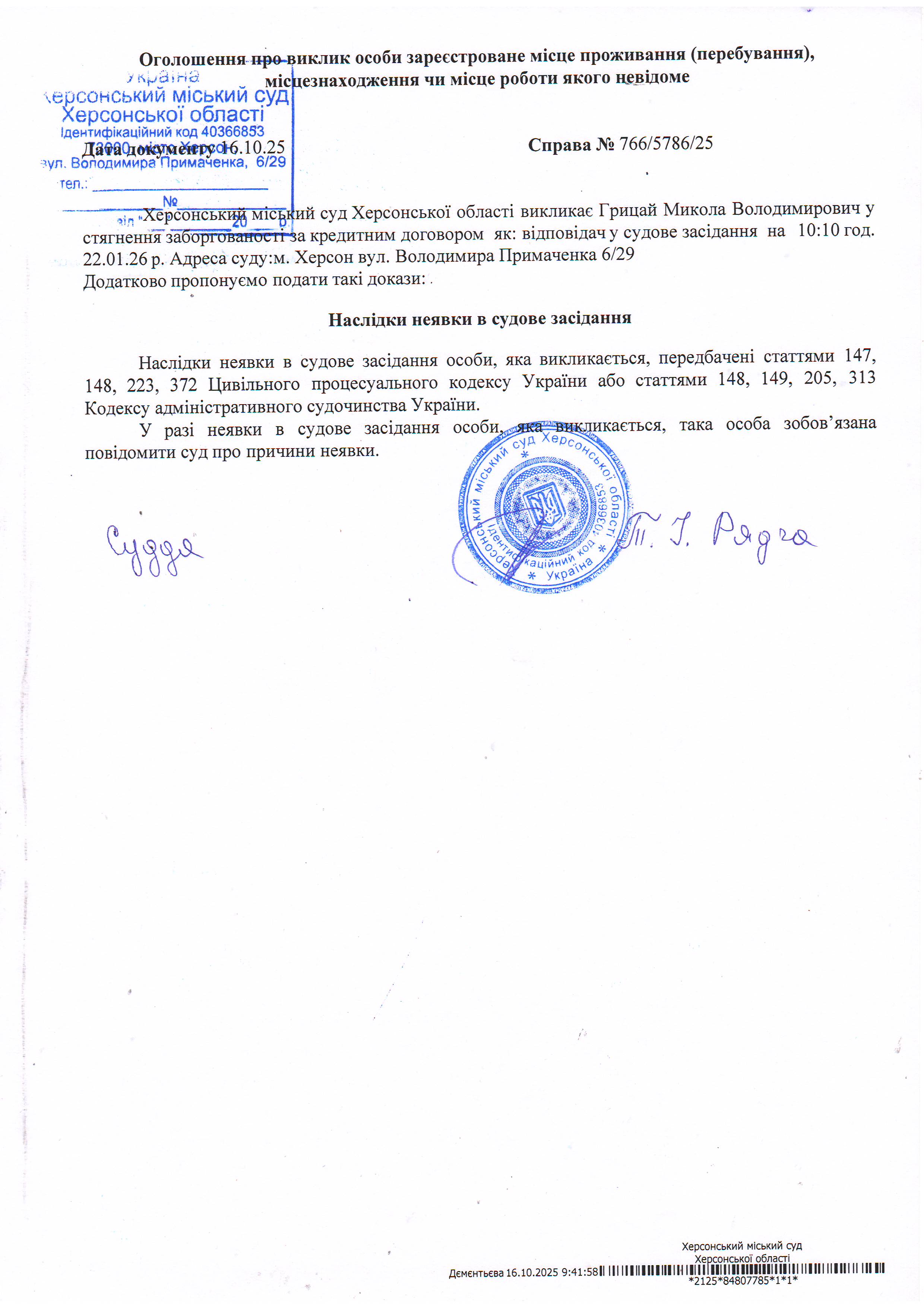 ОГОЛОШЕННЯ ПРО ВИКЛИК ДО СУДУ