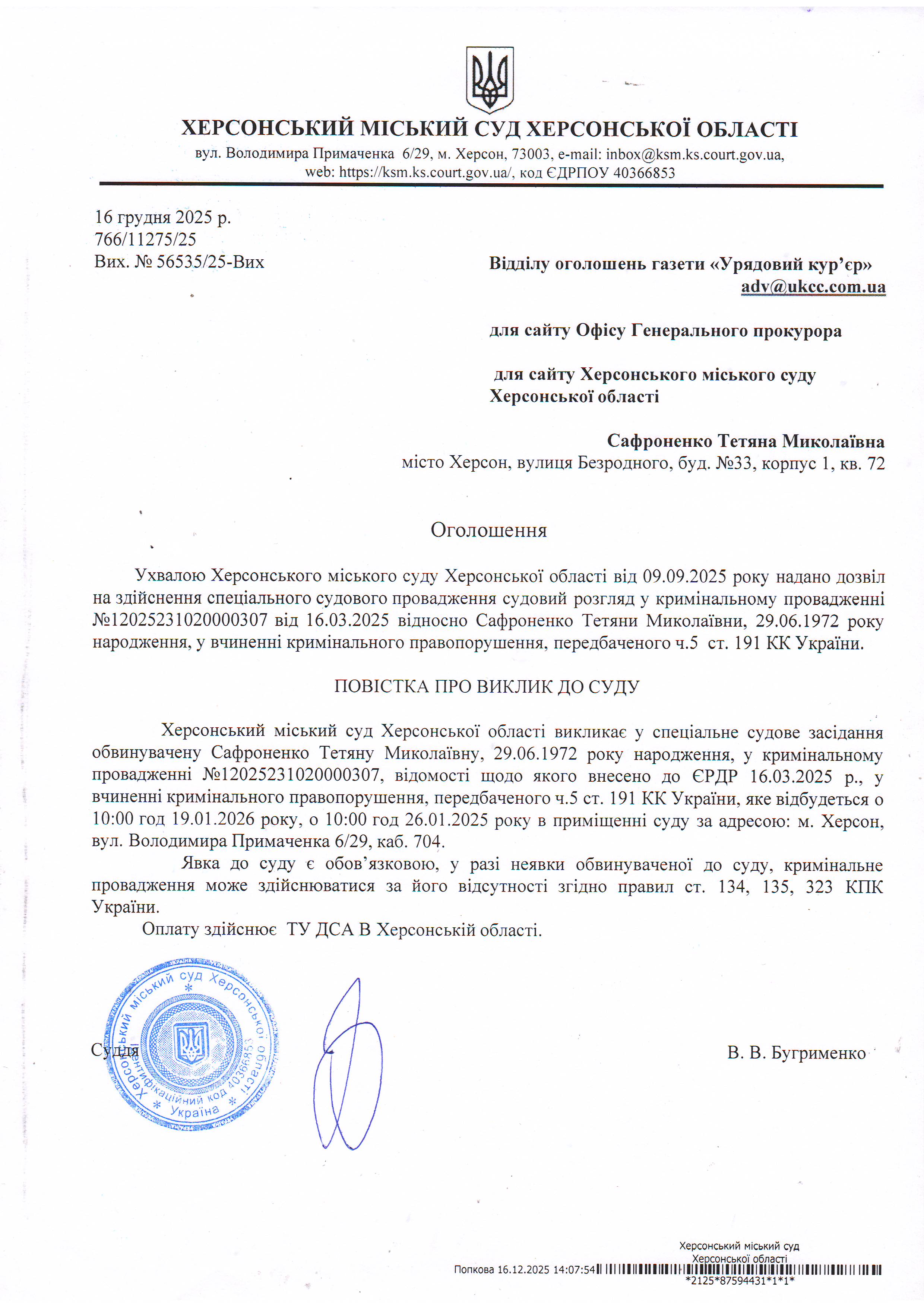 Оголошення про виклик особи в суд та повідомлення про судове рішення