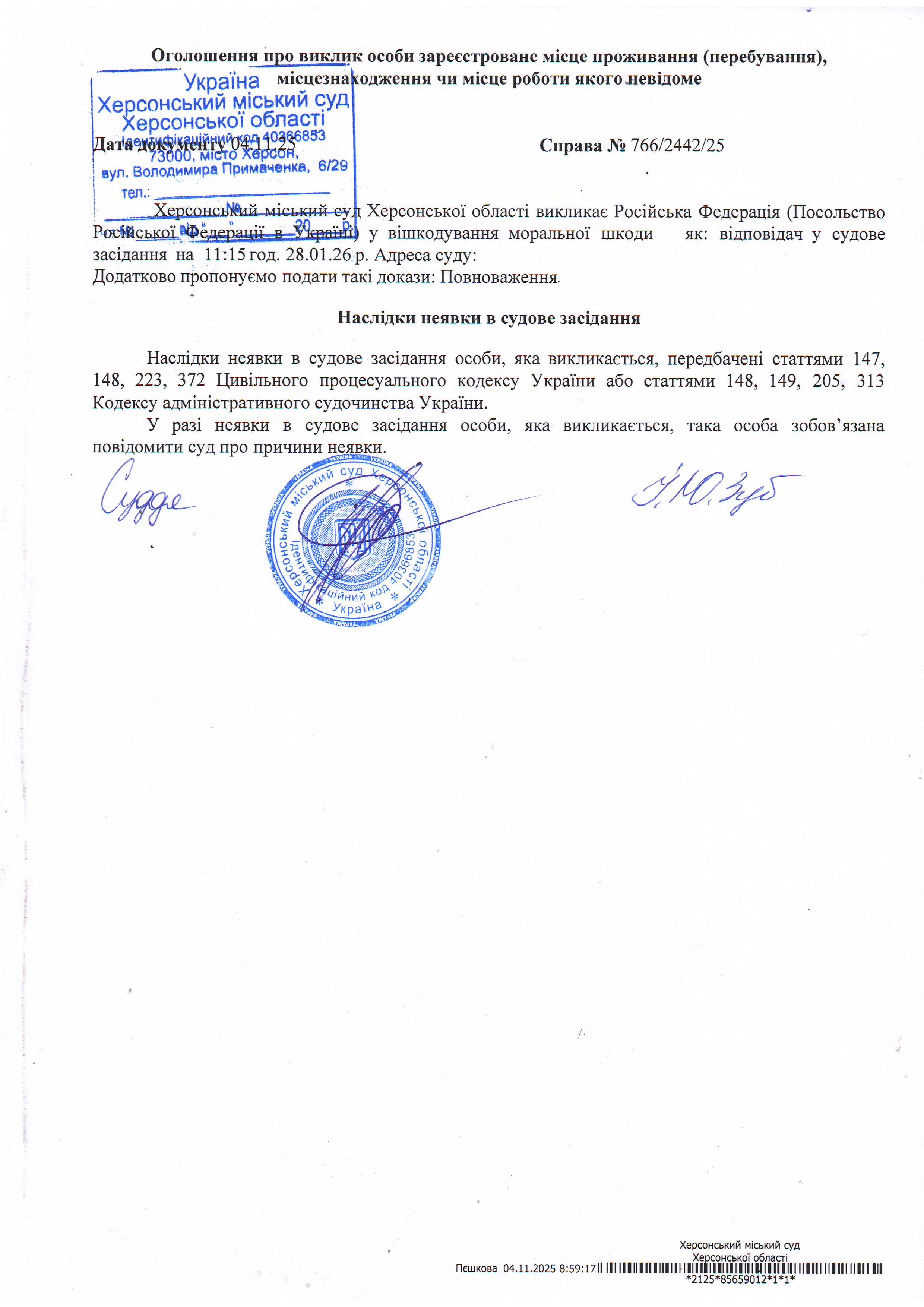 Оголошення про виклик особи в суд та повідомлення про судове рішення