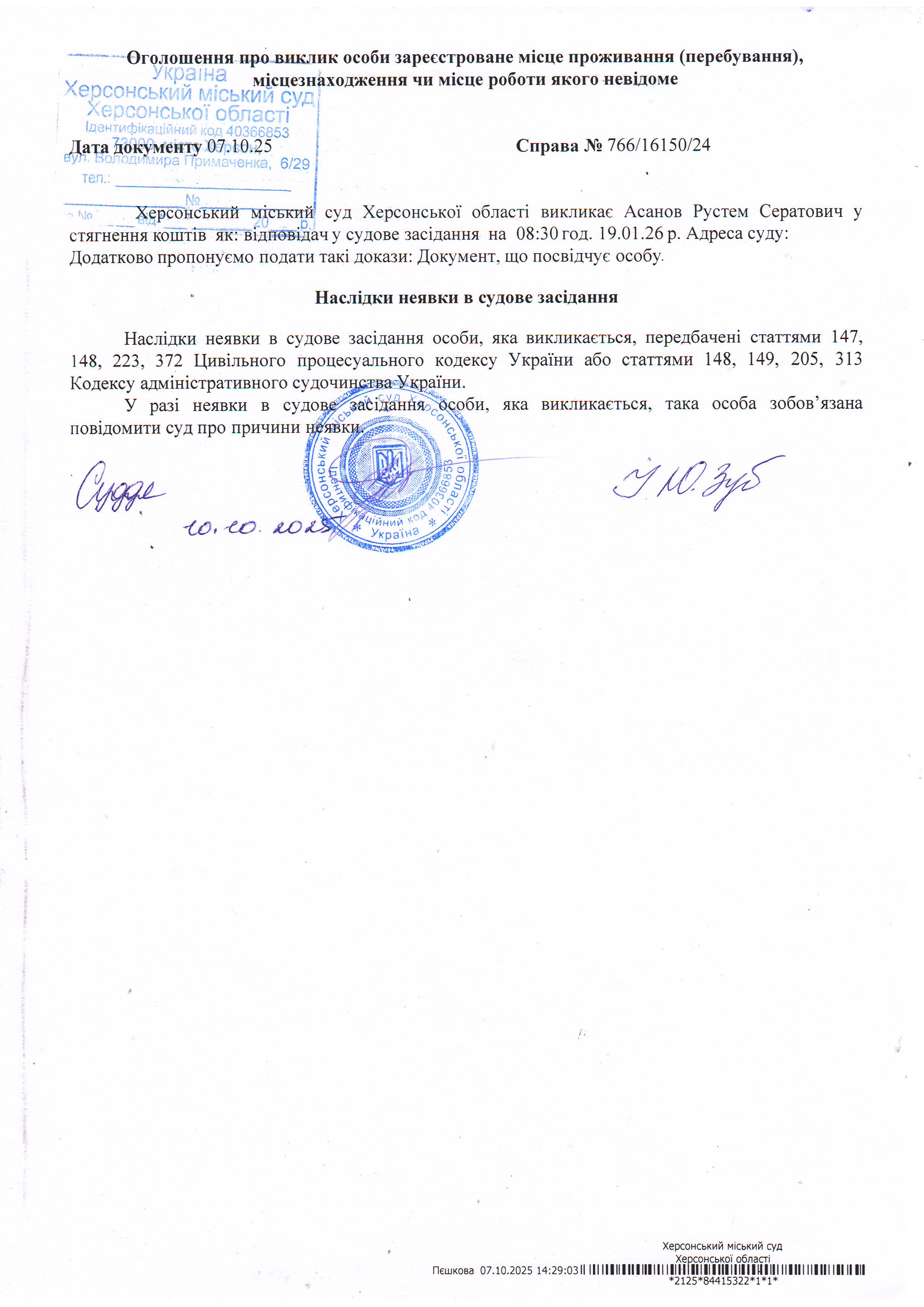 Оголошення про виклик особи в суд та повідомлення про судове рішення