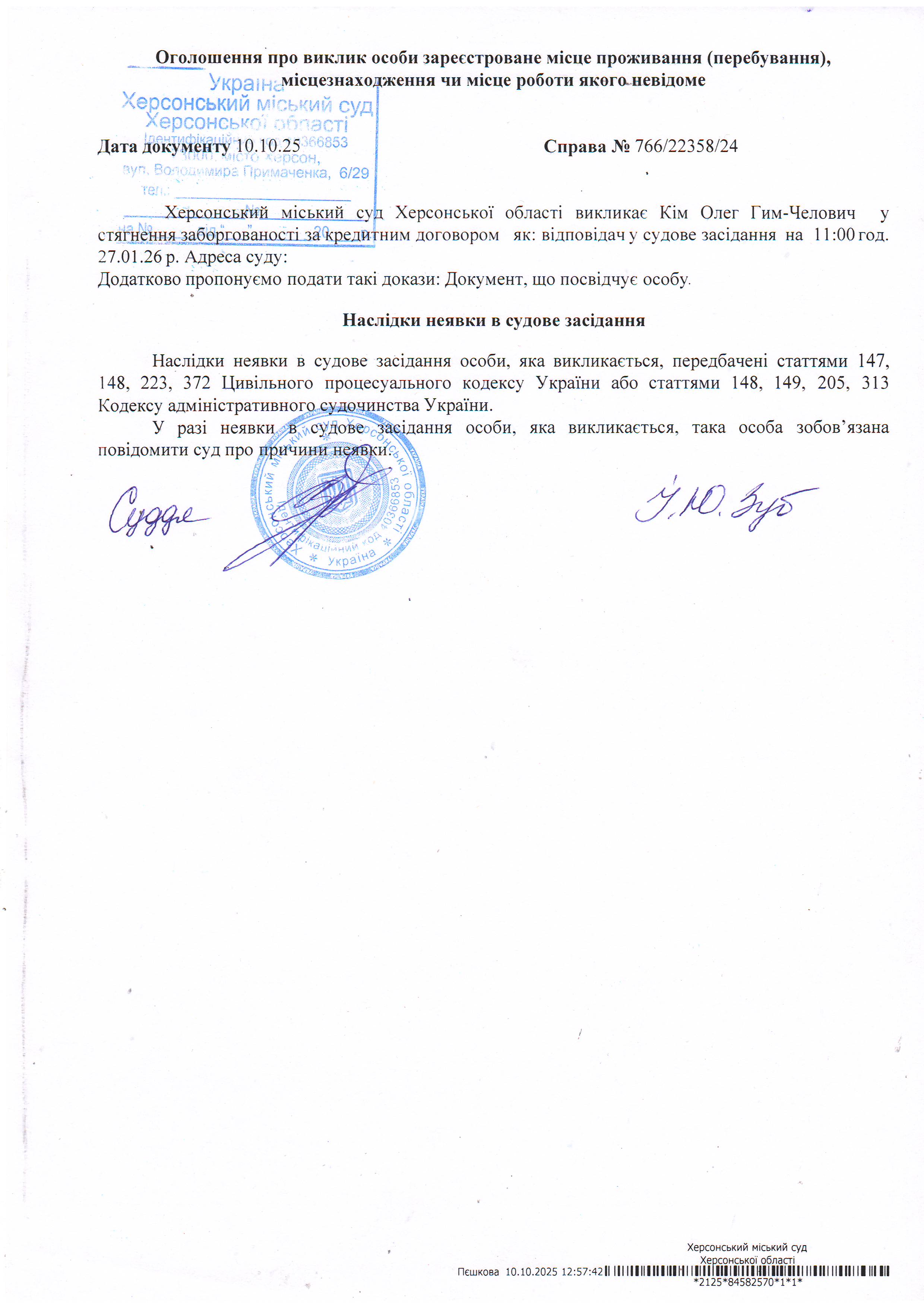 ОГОЛОШЕННЯ ПРО ВИКЛИК ДО СУДУ