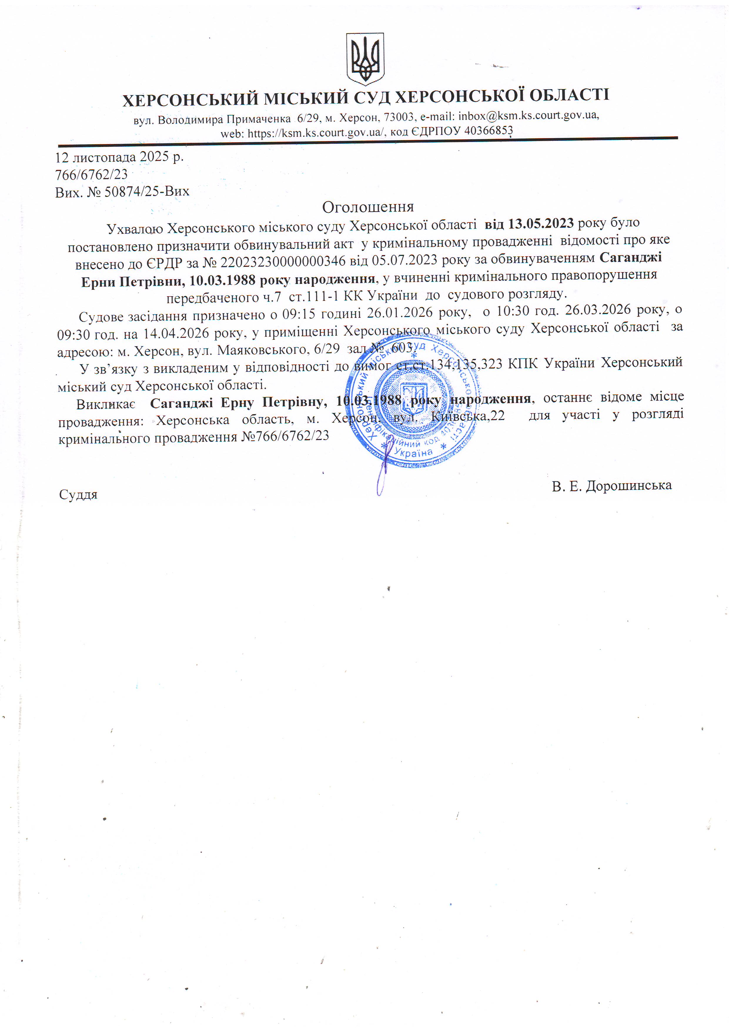 ОГОЛОШЕННЯ ПРО ВИКЛИК ДО СУДУ
