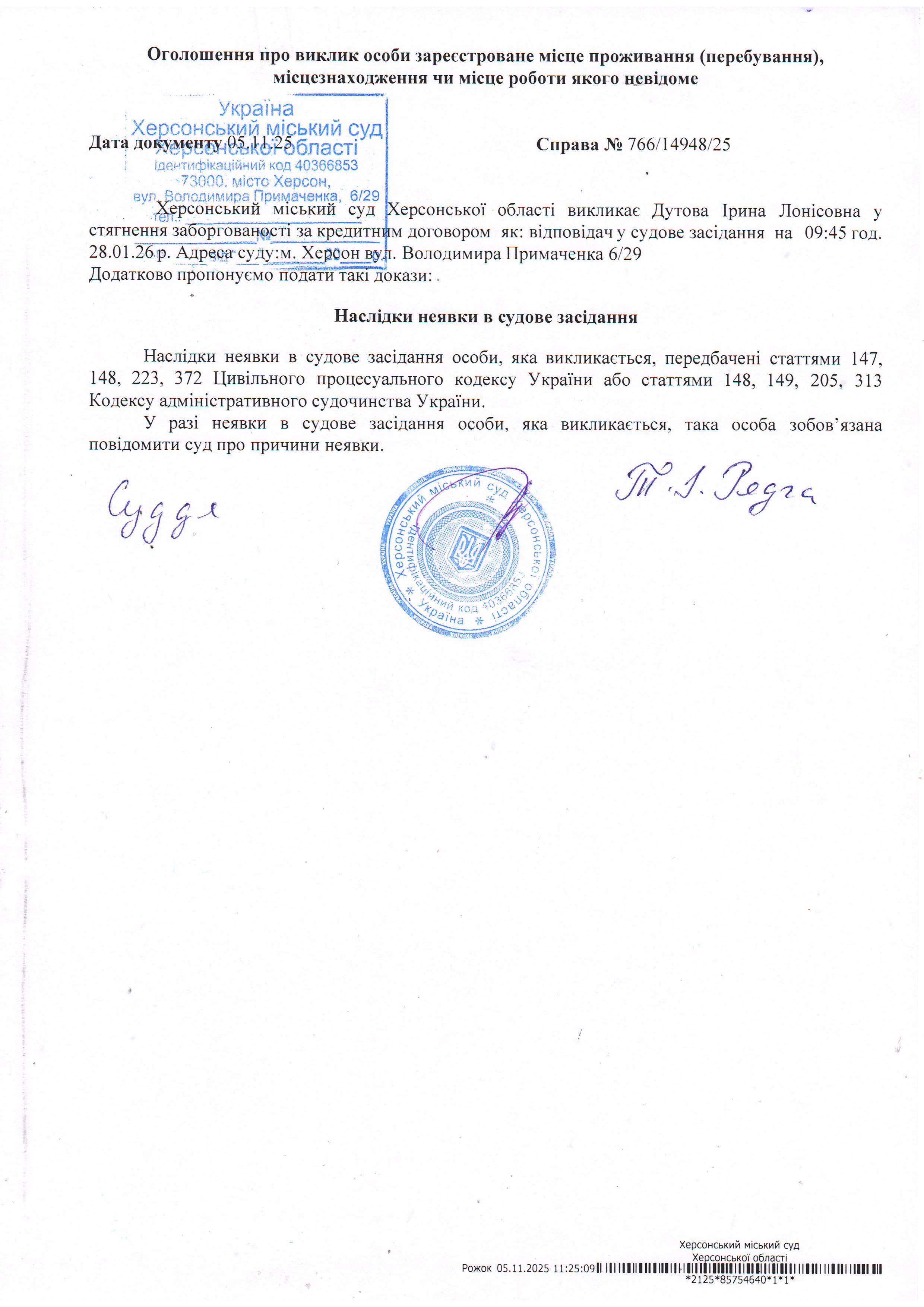 ПОВІДОМЛЕННЯ ПРО РОЗГЛЯД СПРАВИ БЕЗ ВИКЛИКУ СТОРІН
