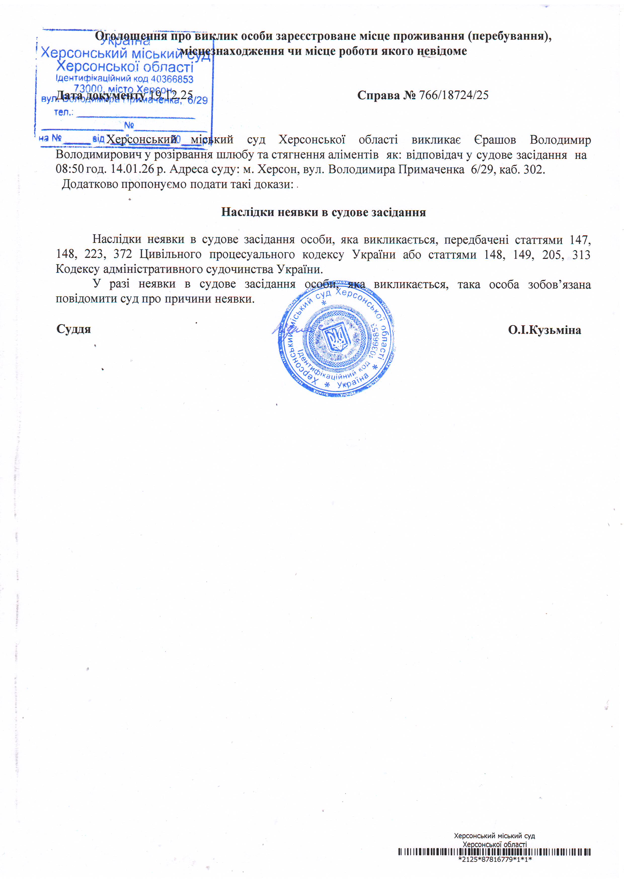 ОГОЛОШЕННЯ ПРО ВИКЛИК ДО СУДУ