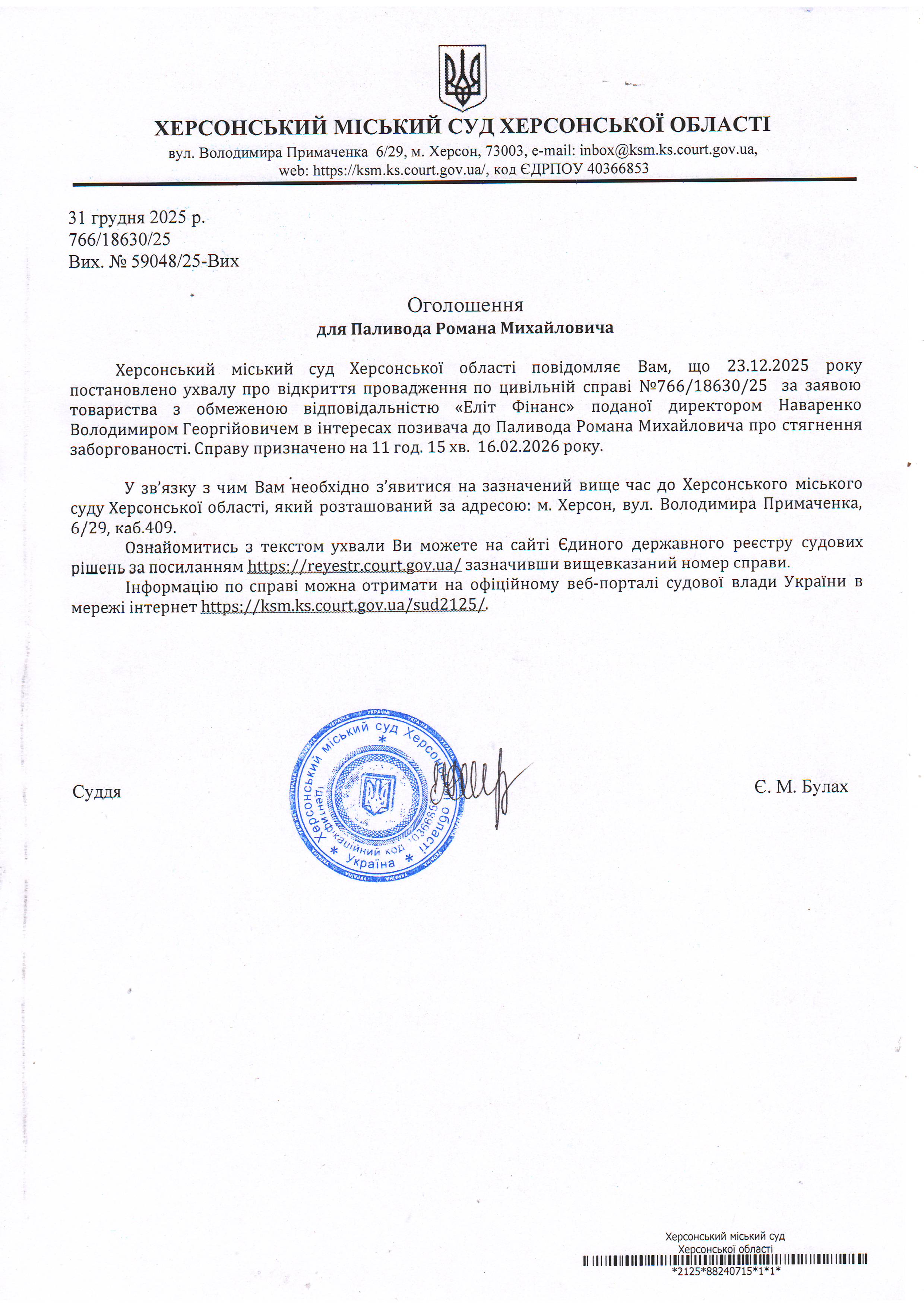 ОГОЛОШЕННЯ ПРО ВИКЛИК ДО СУДУ
