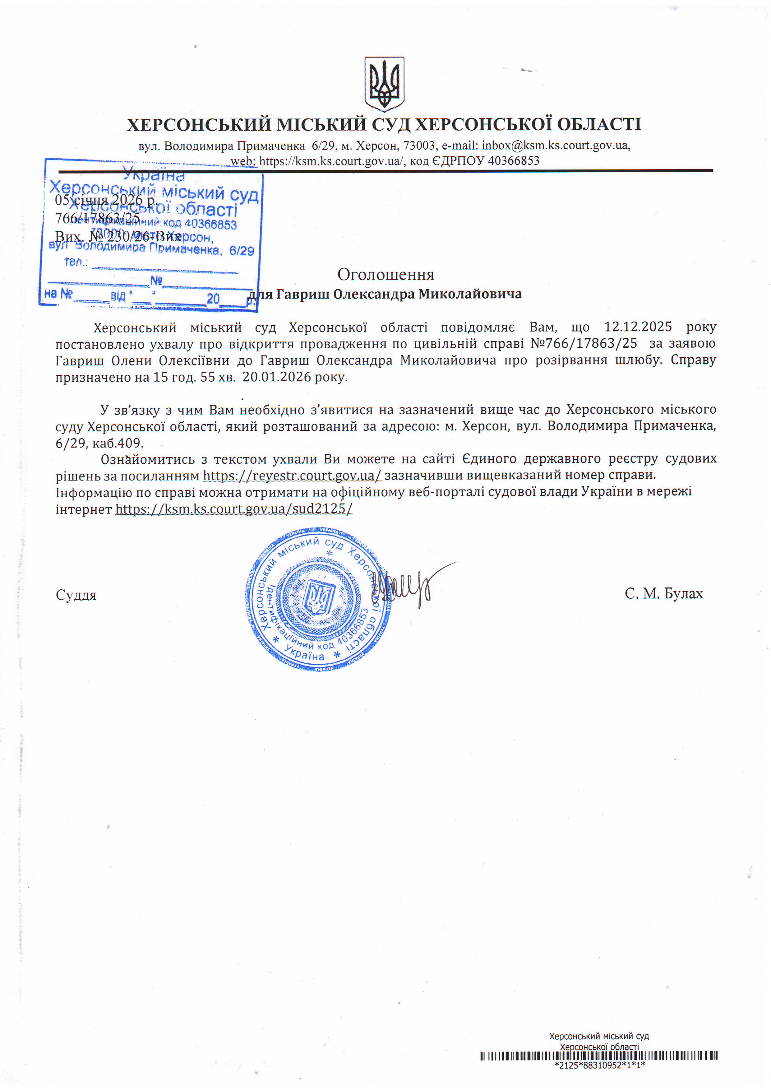 ОГОЛОШЕННЯ ПРО ВИКЛИК ДО СУДУ