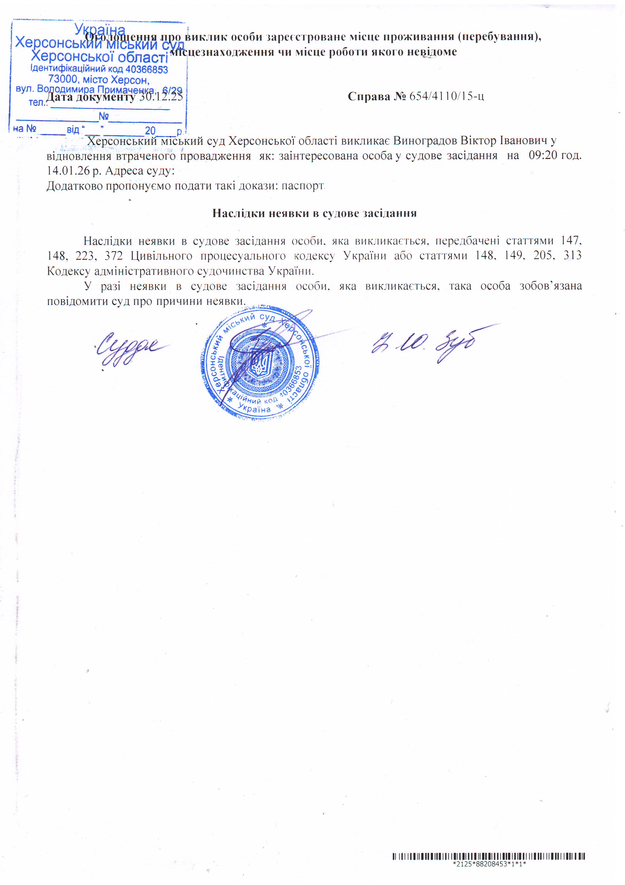 Оголошення про виклик особи в суд та повідомлення про судове рішення