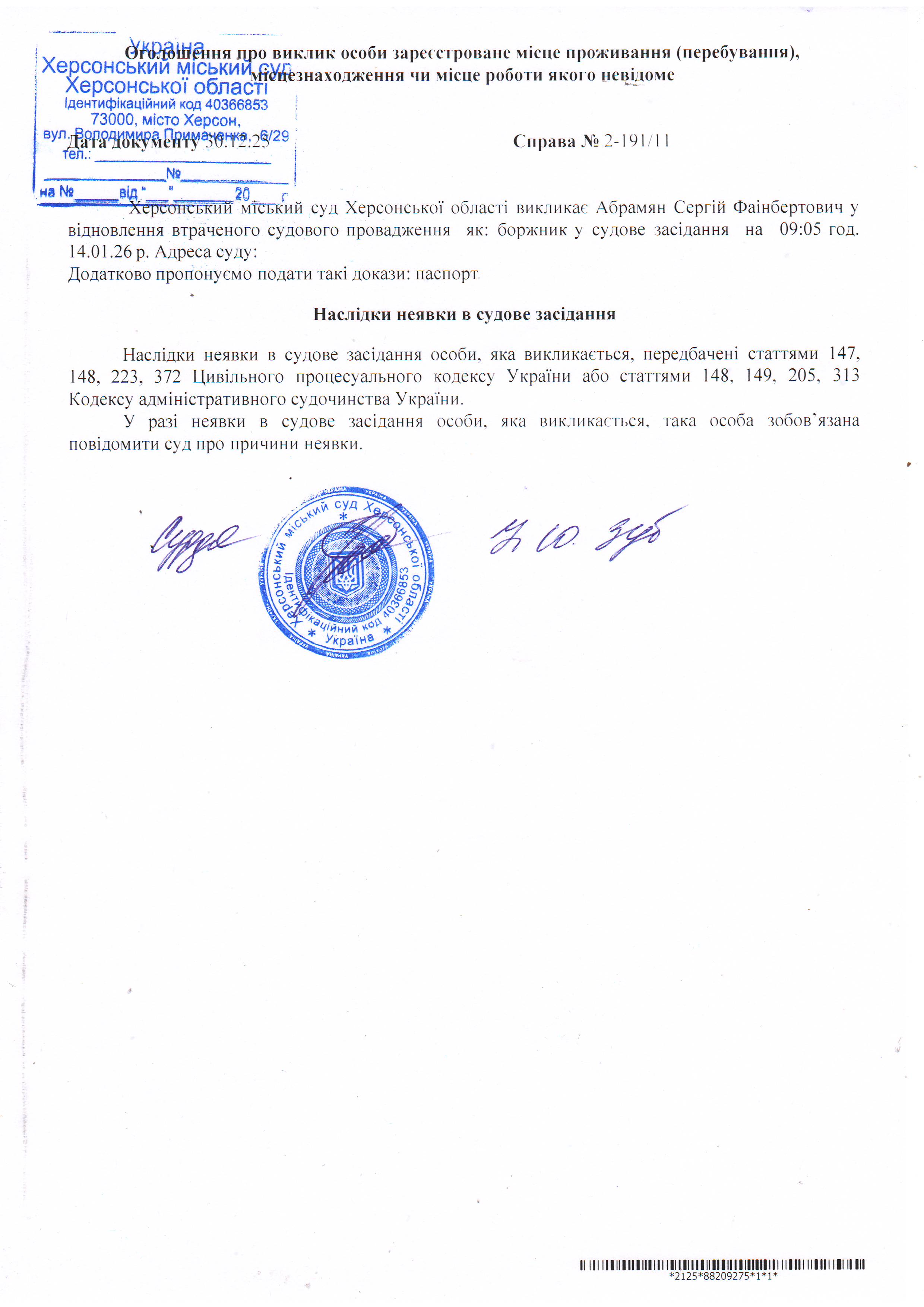 Оголошення про виклик особи в суд та повідомлення про судове рішення