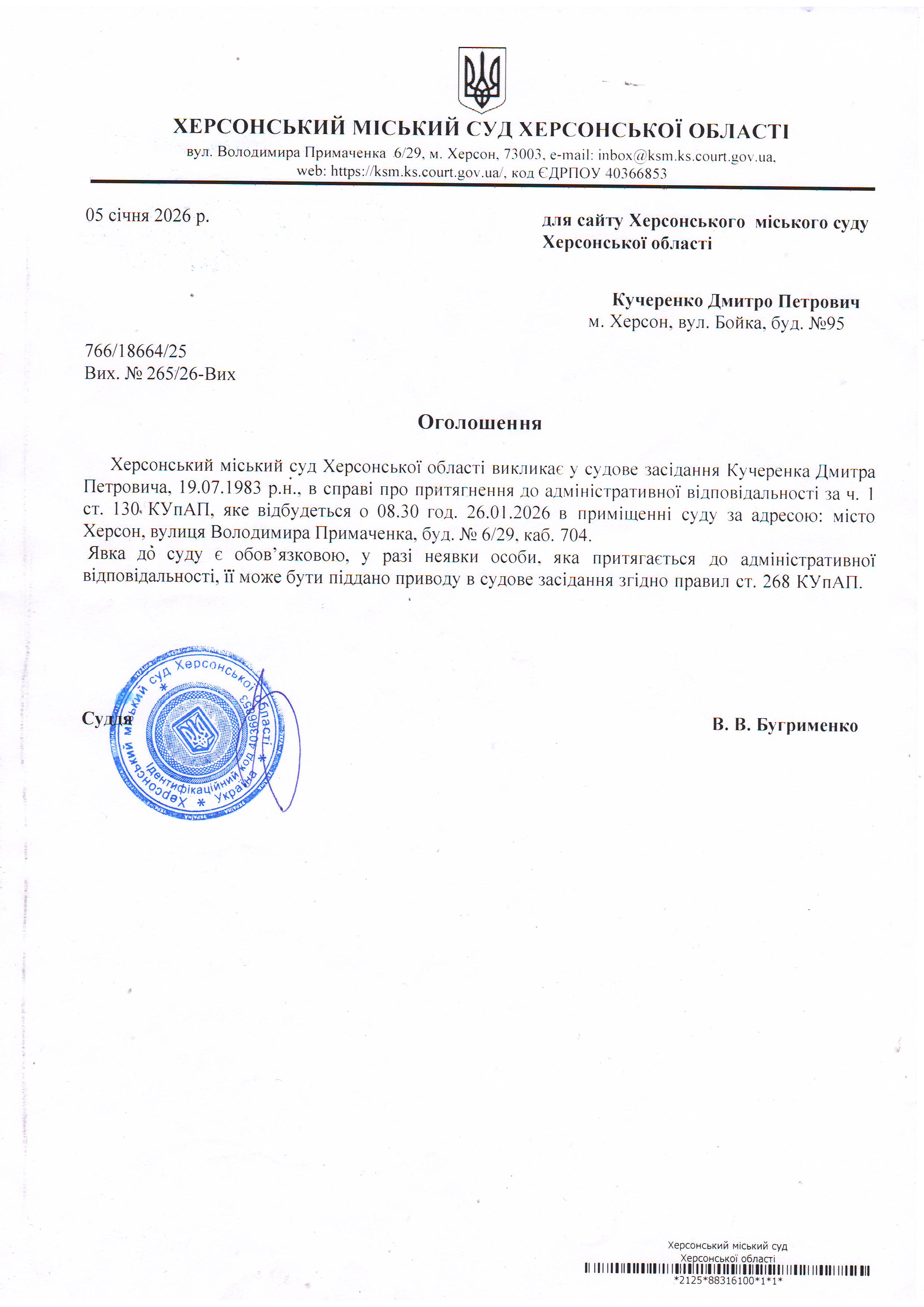 ОГОЛОШЕННЯ ПРО ВИКЛИК ДО СУДУ
