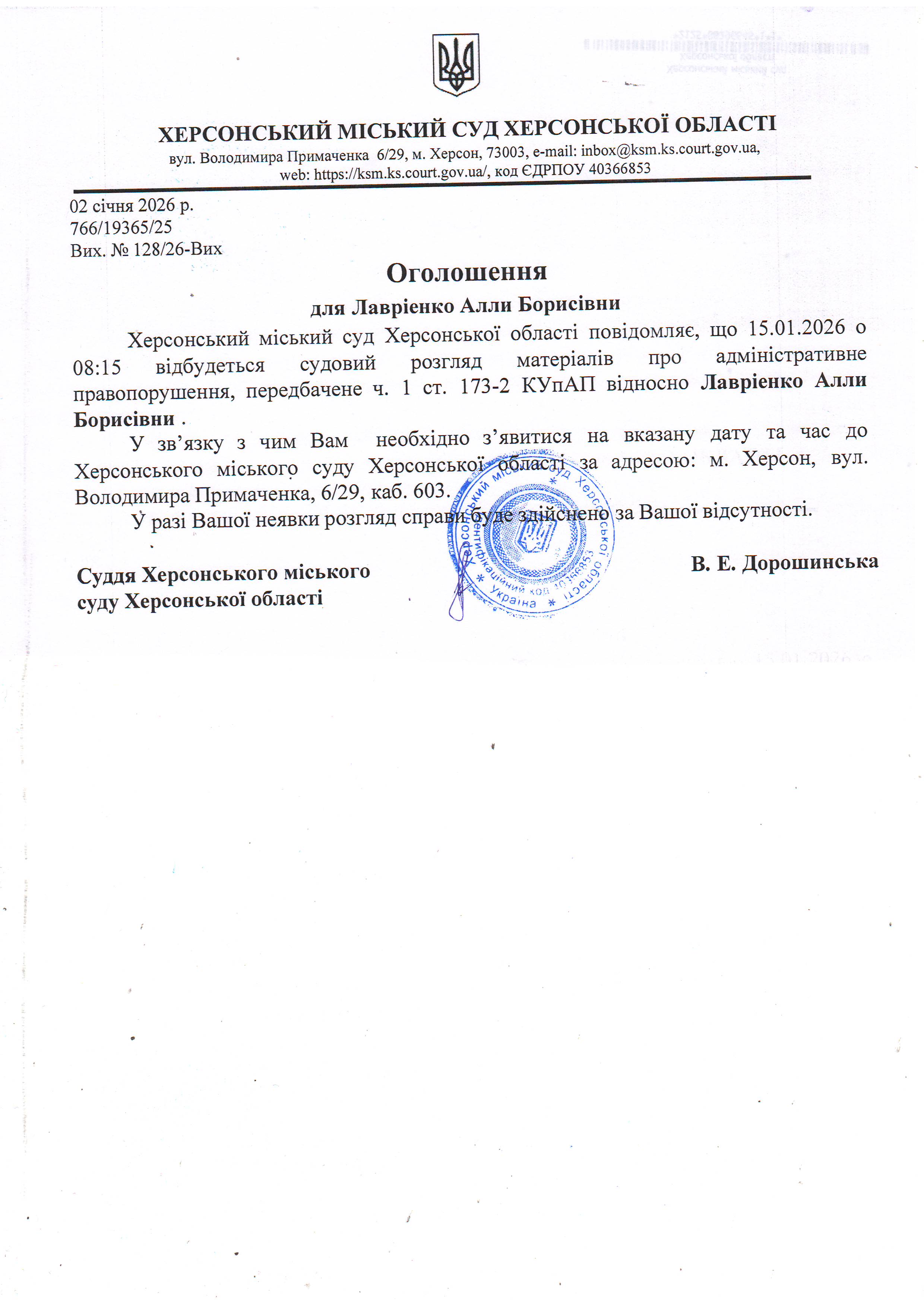 Оголошення для Лаврієнко Алли Борисівни