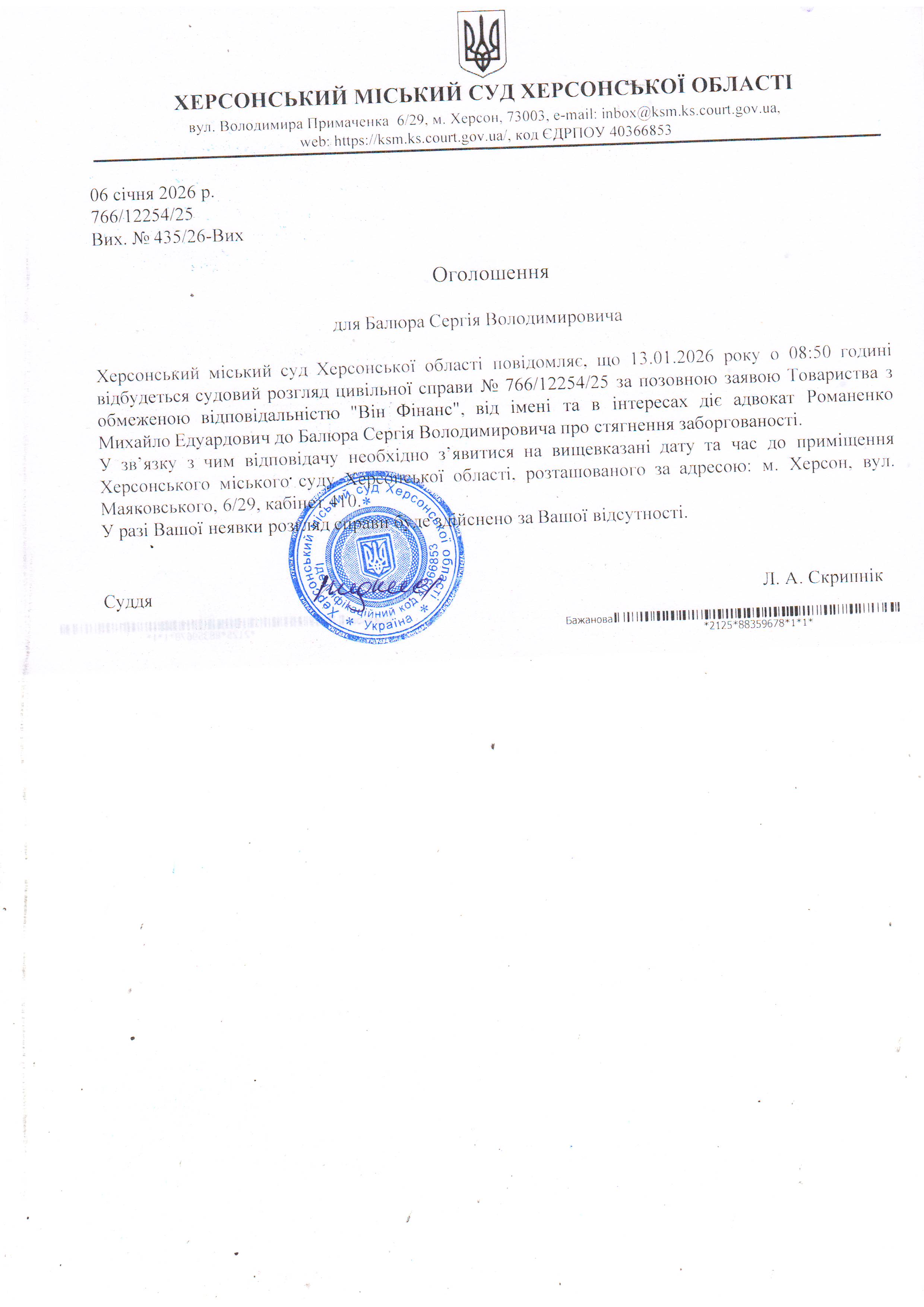 ОГОЛОШЕННЯ ПРО ВИКЛИК ДО СУДУ