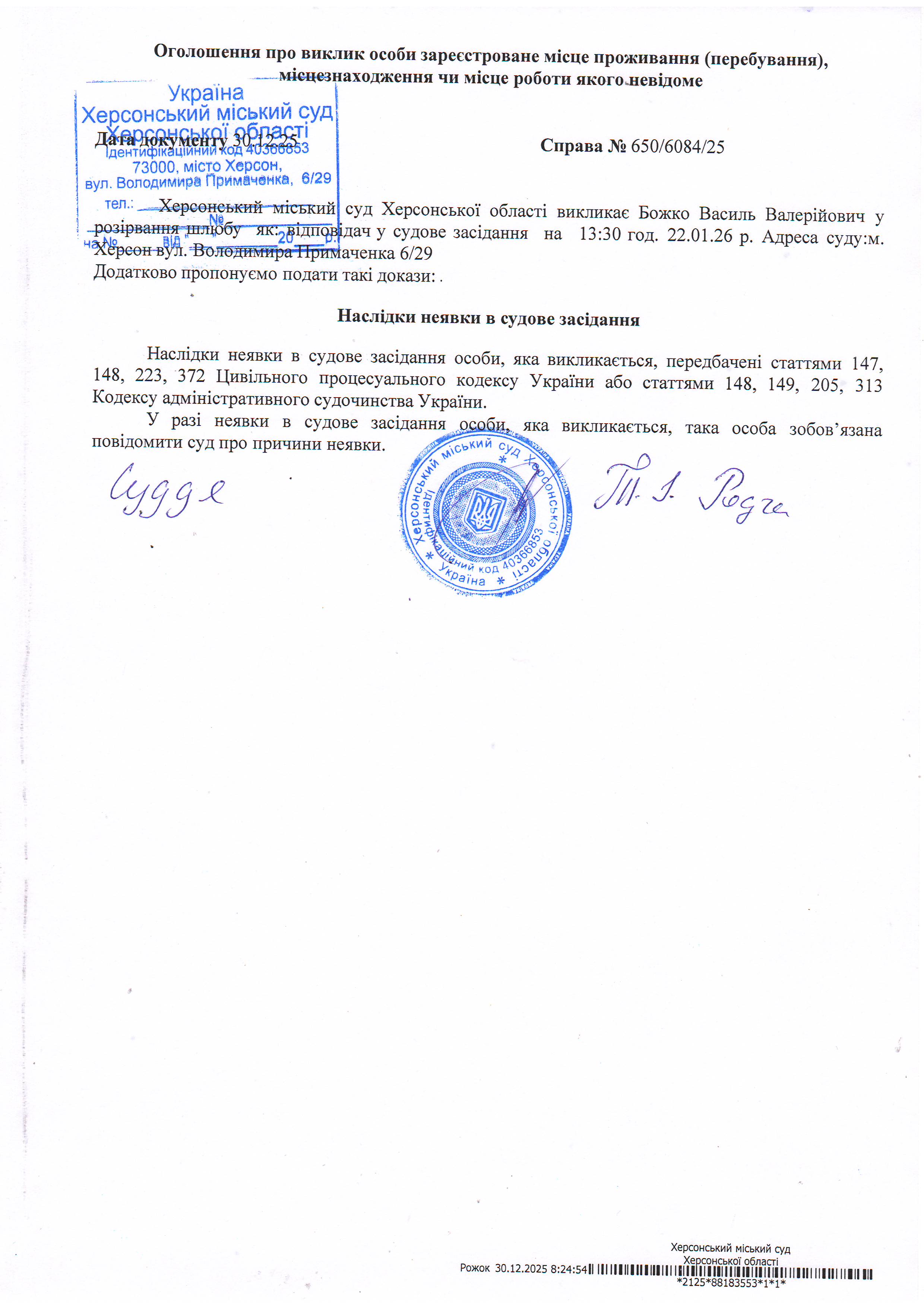 Оголошення про виклик особи в суд та повідомлення про судове рішення