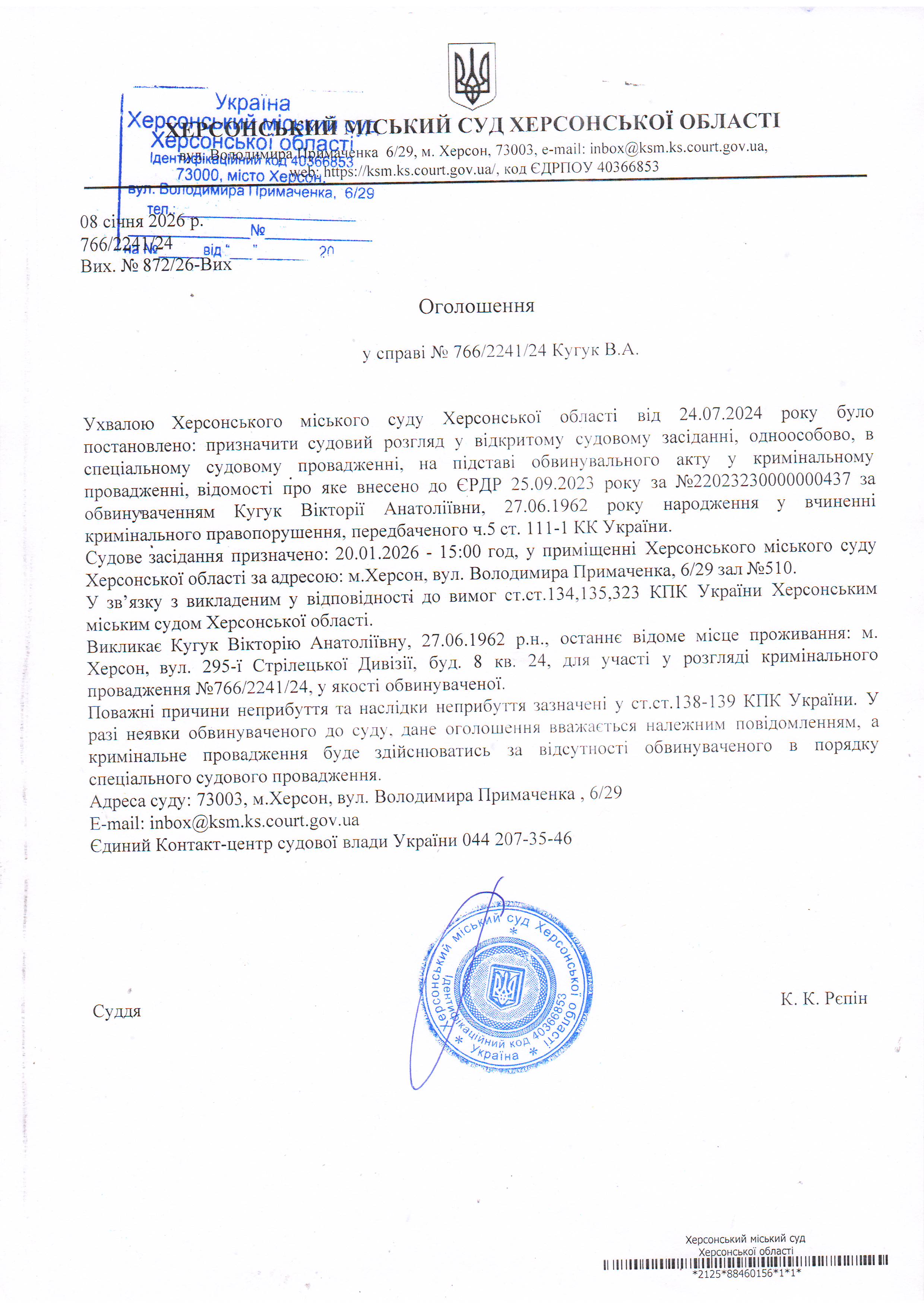 Оголошення про виклик особи в суд та повідомлення про судове рішення