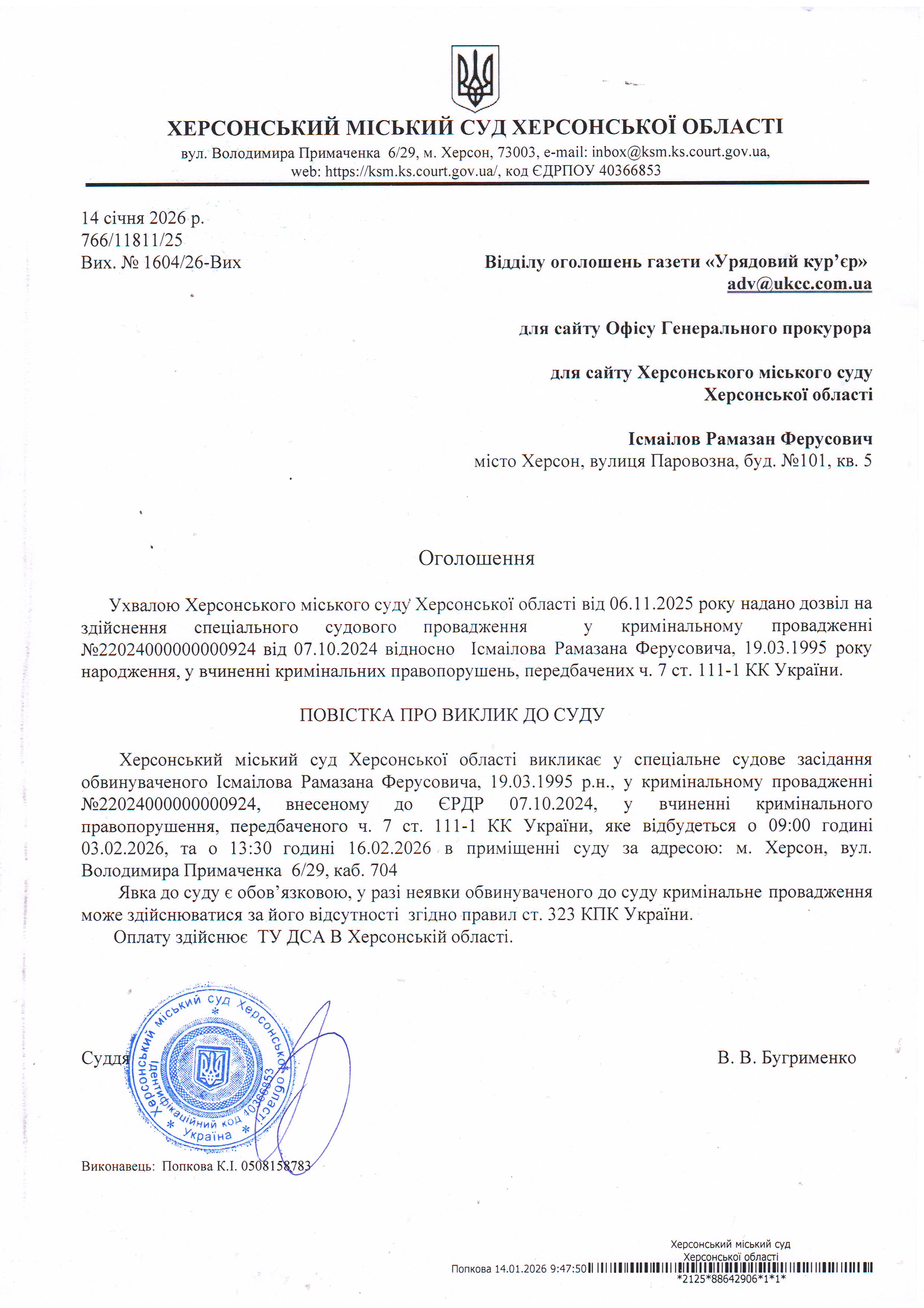 Оголошення про виклик особи в суд та повідомлення про судове рішення