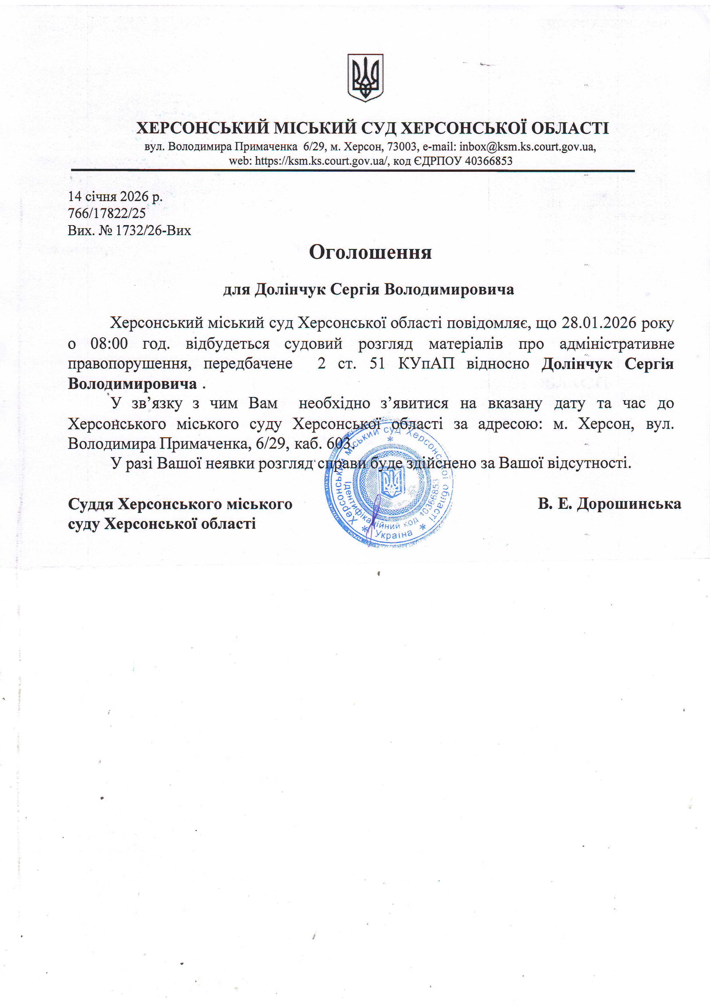 ОГОЛОШЕННЯ ПРО ВИКЛИК ДО СУДУ