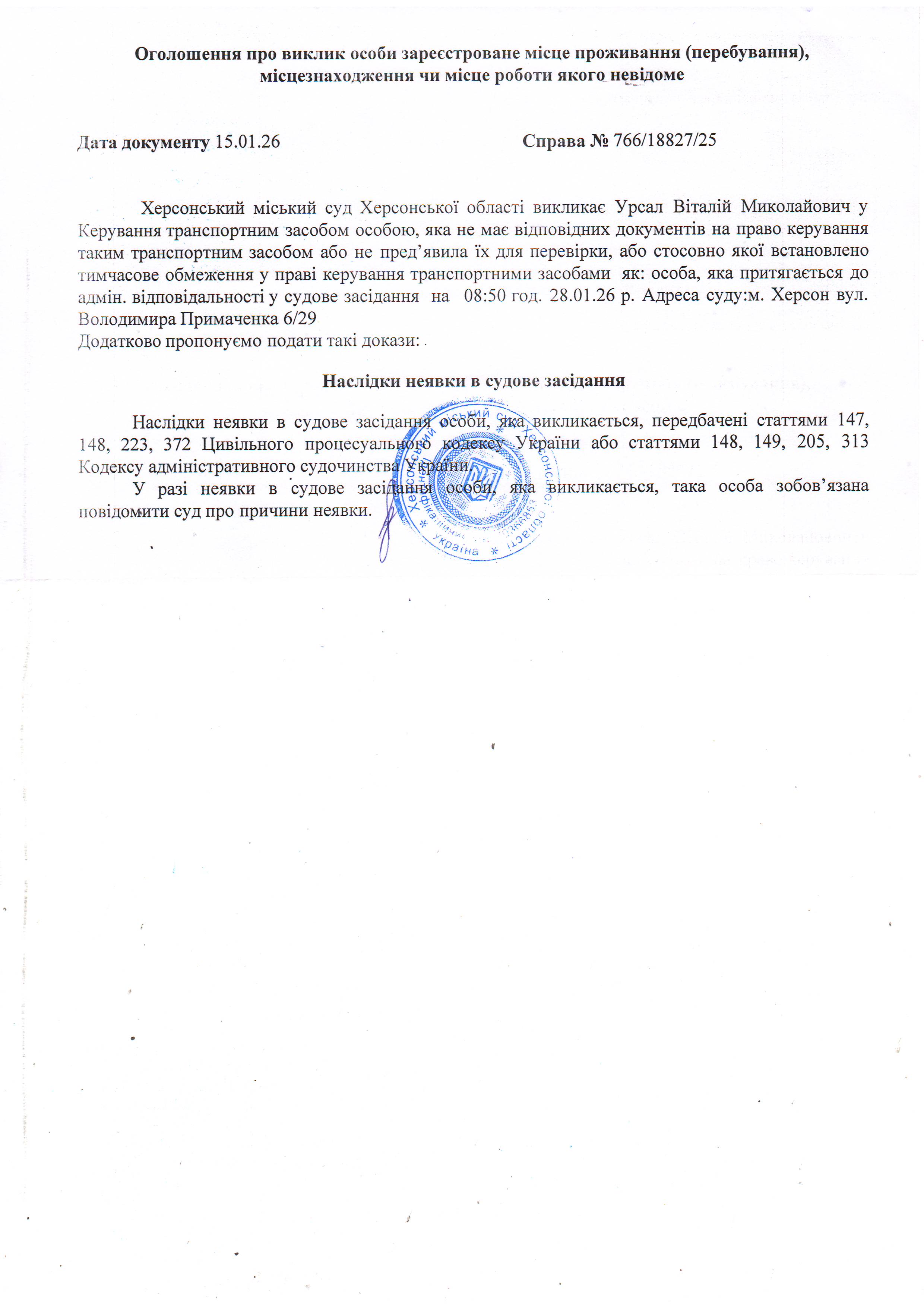 ОГОЛОШЕННЯ ПРО ВИКЛИК ДО СУДУ