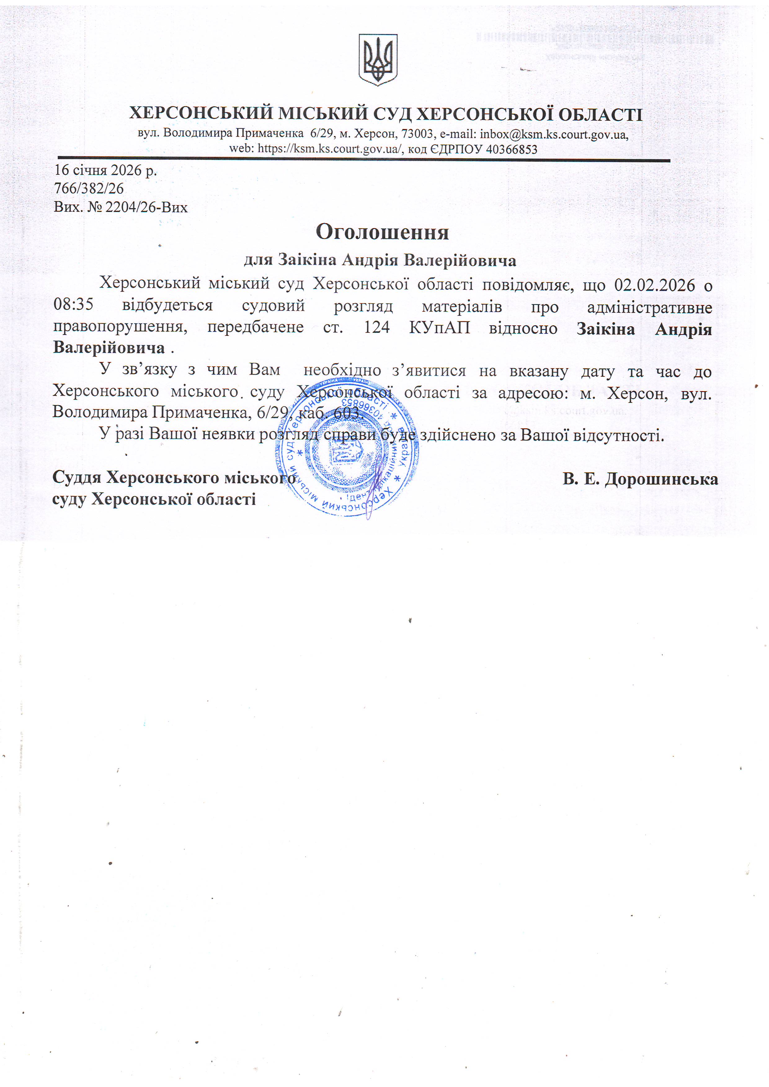 ОГОЛОШЕННЯ ПРО ВИКЛИК ДО СУДУ
