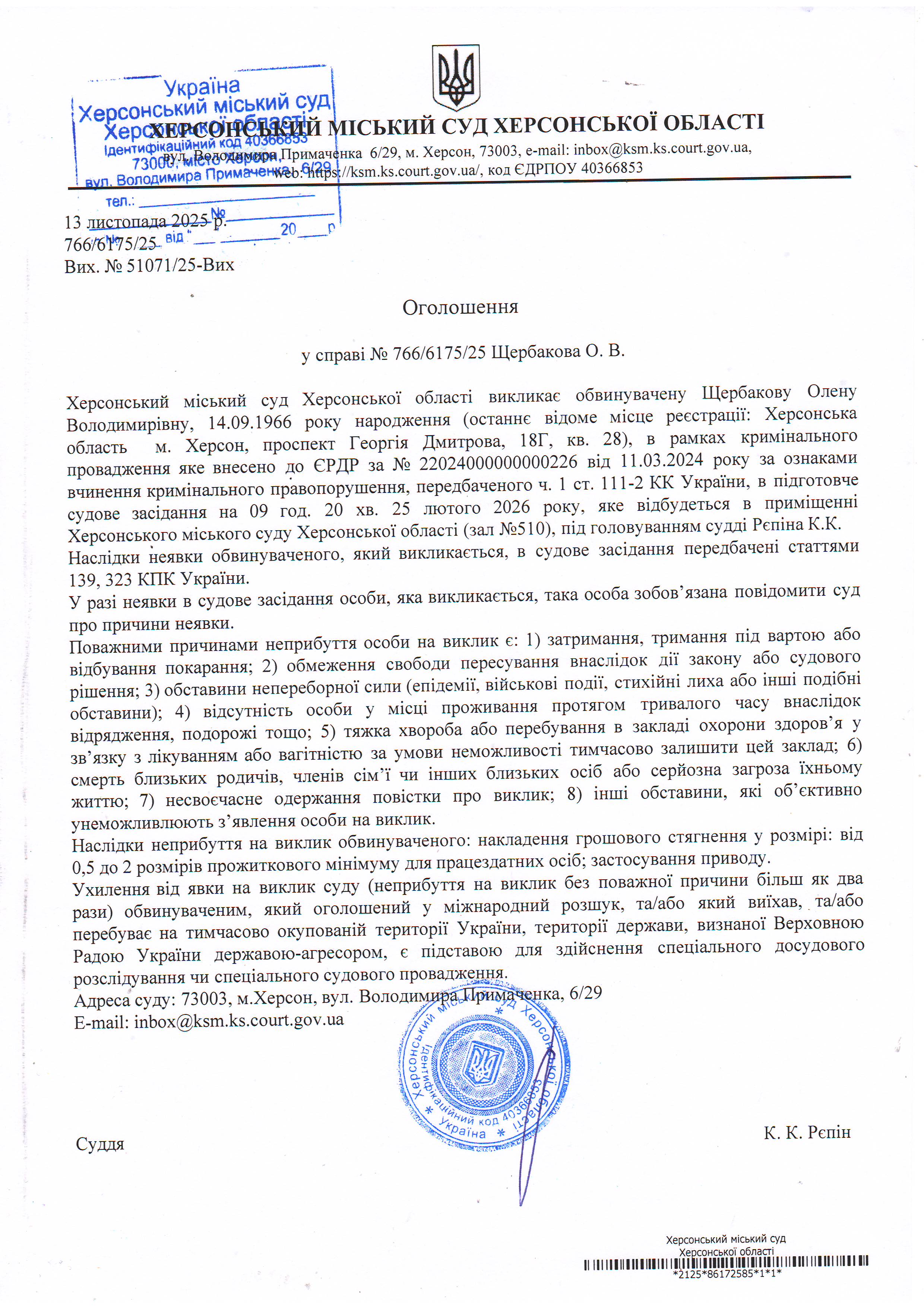 ОГОЛОШЕННЯ ПРО ВИКЛИК ДО СУДУ