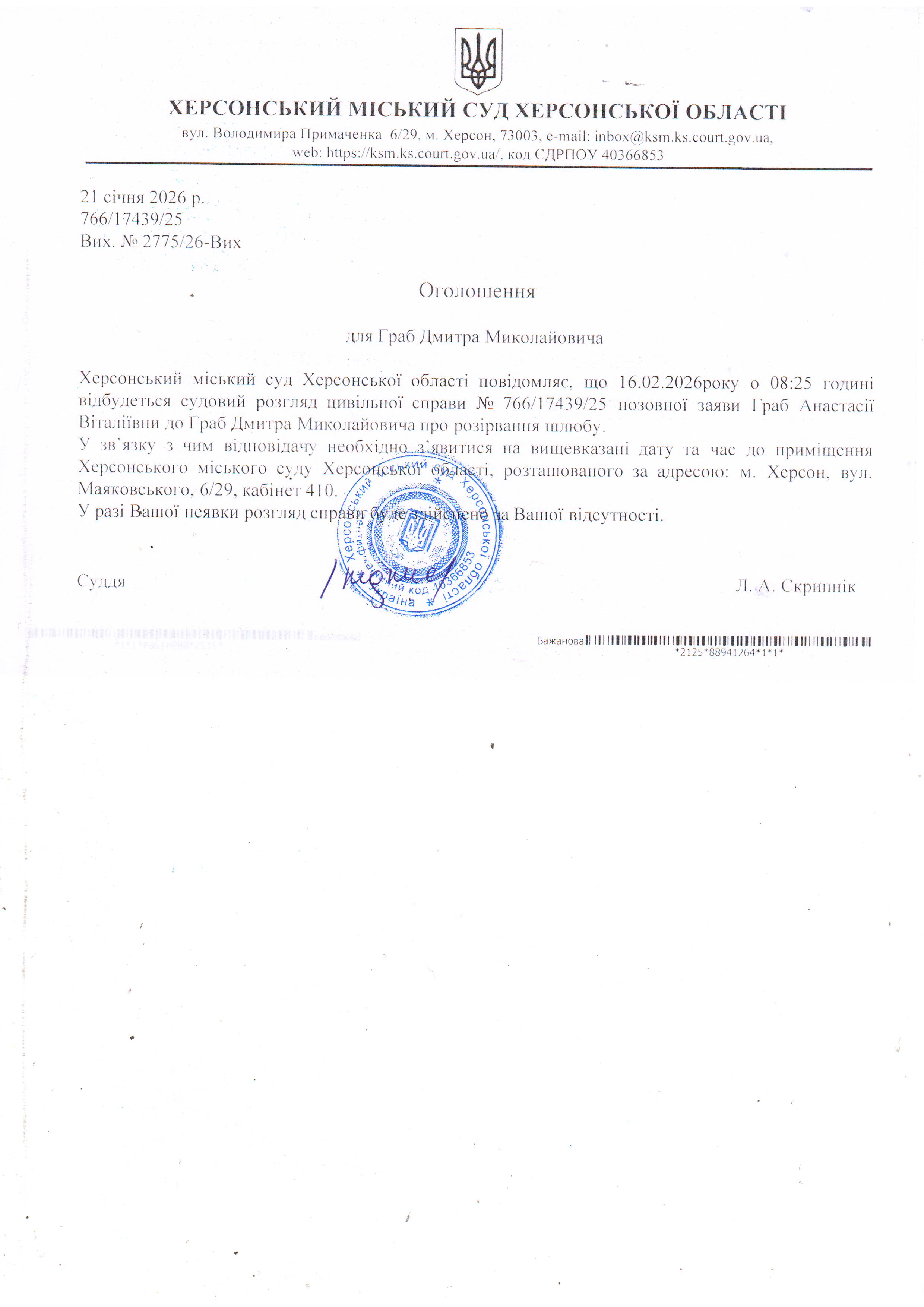 ОГОЛОШЕННЯ ПРО ВИКЛИК ДО СУДУ